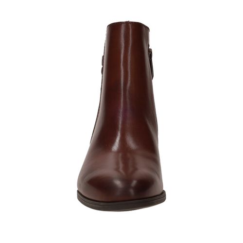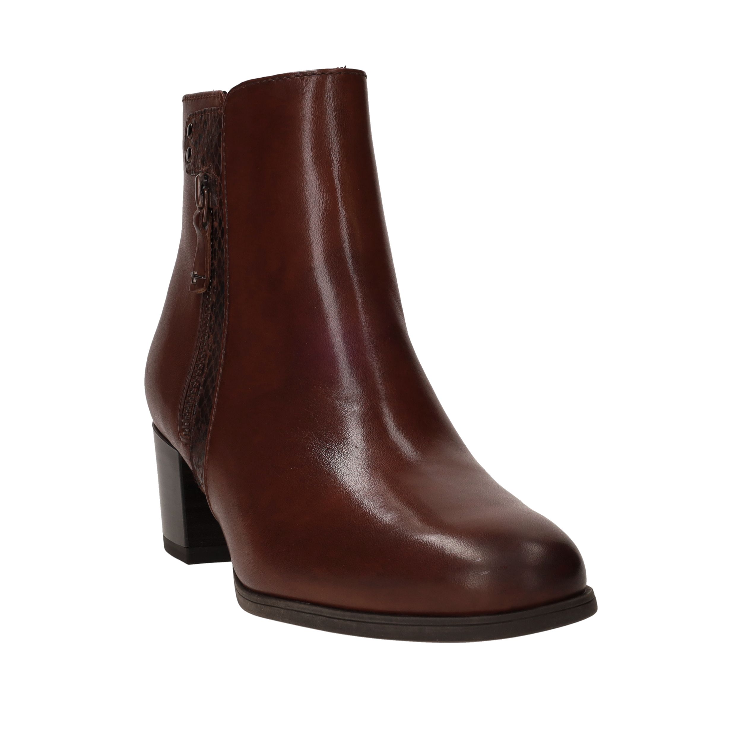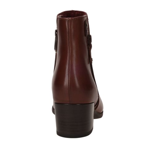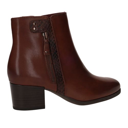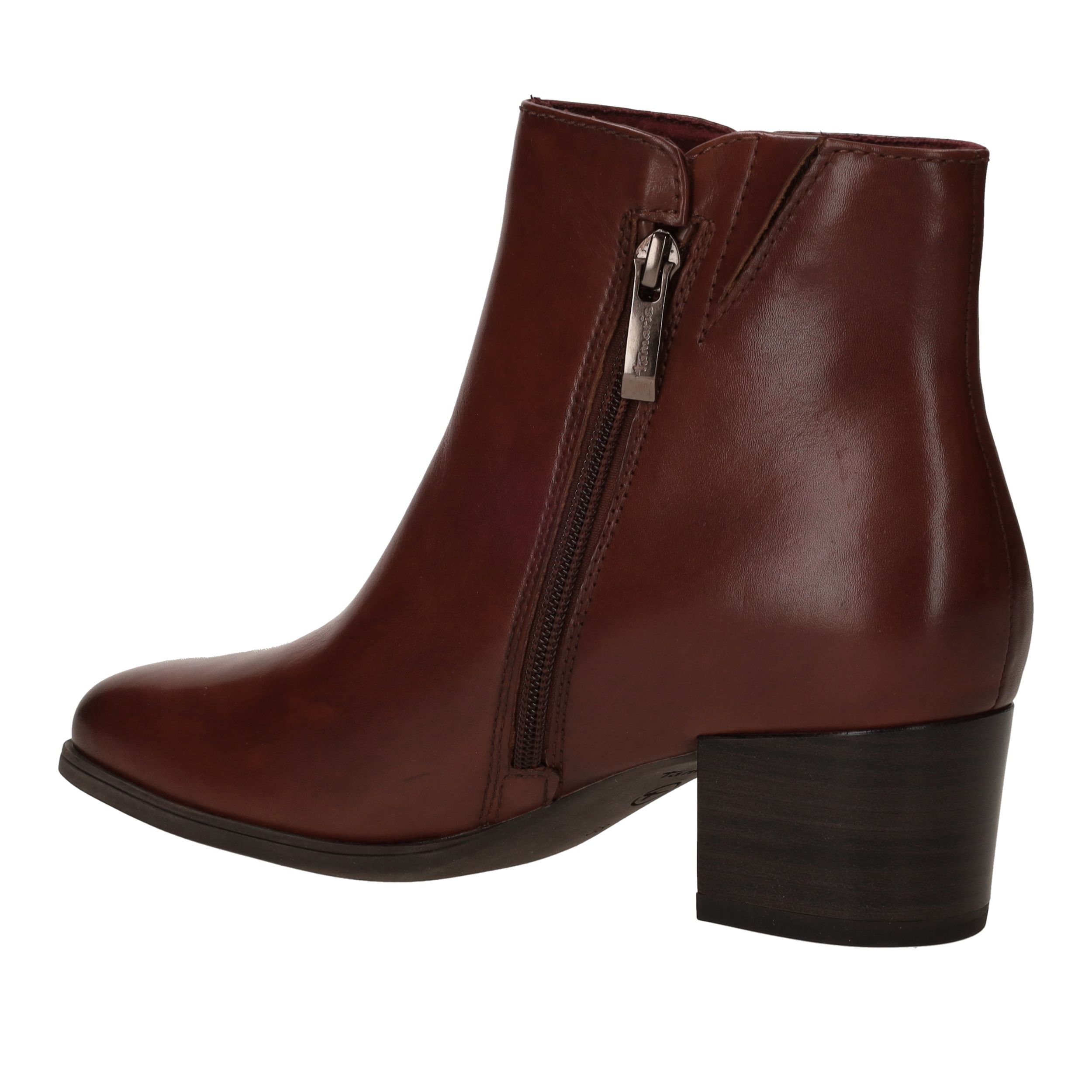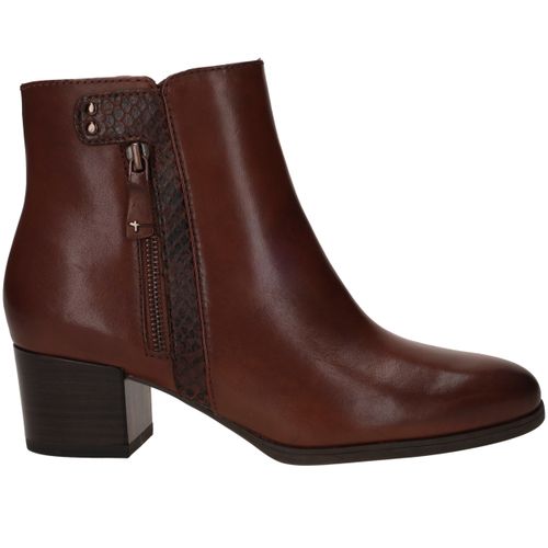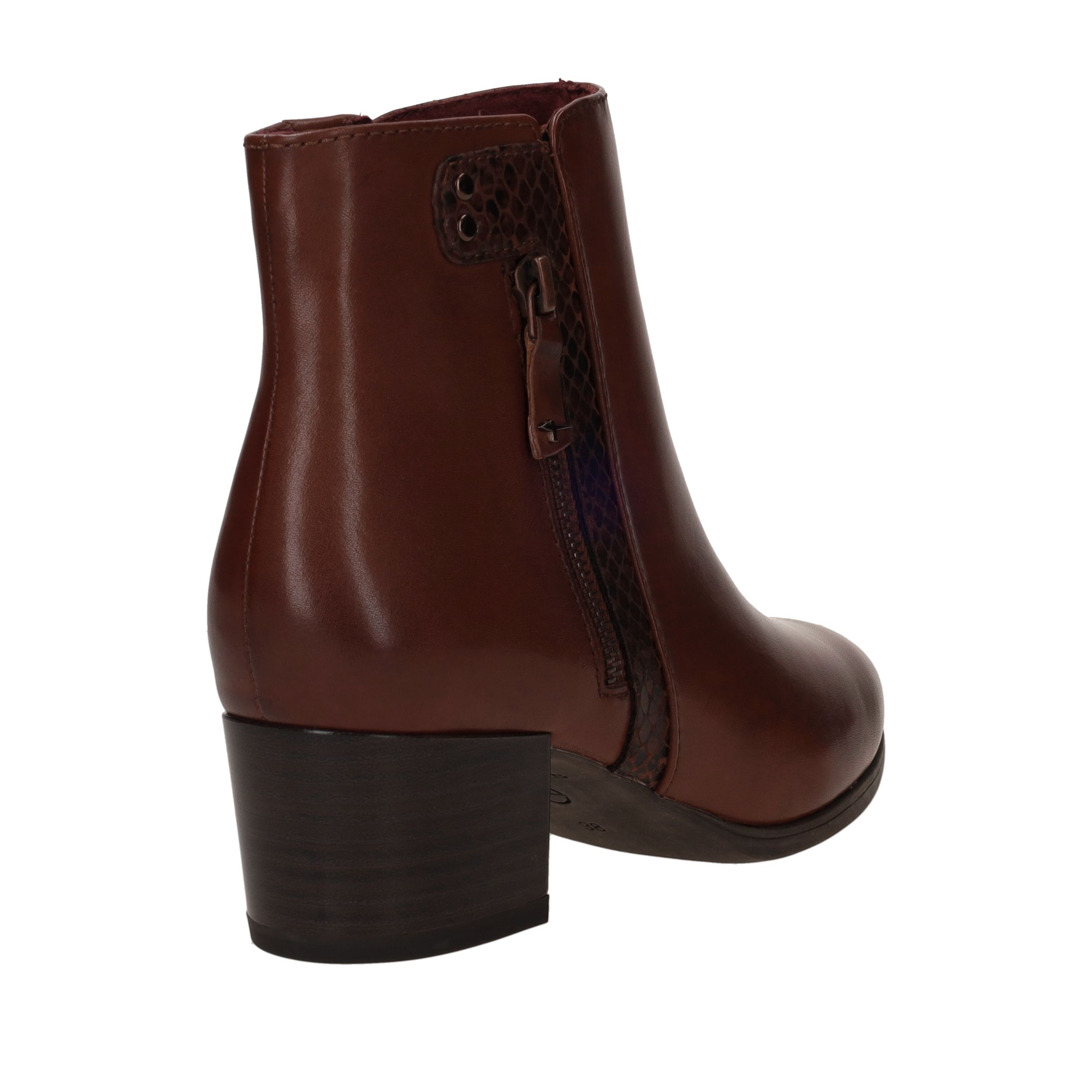 De Tamaris enkellaarsjes zijn een stijlvolle en comfortabele keuze voor dames die houden van elegantie met een vleugje luxe. Deze cognackleurige dames laarzen zijn uitgevoerd in hoogwaardig leer en hebben een subtiel reliëfdetail langs de rits dat zorgt voor een chique uitstraling. Dankzij de stabiele blokhak zijn ze ideaal voor dagelijks gebruik en geven ze je outfit een modieuze boost.