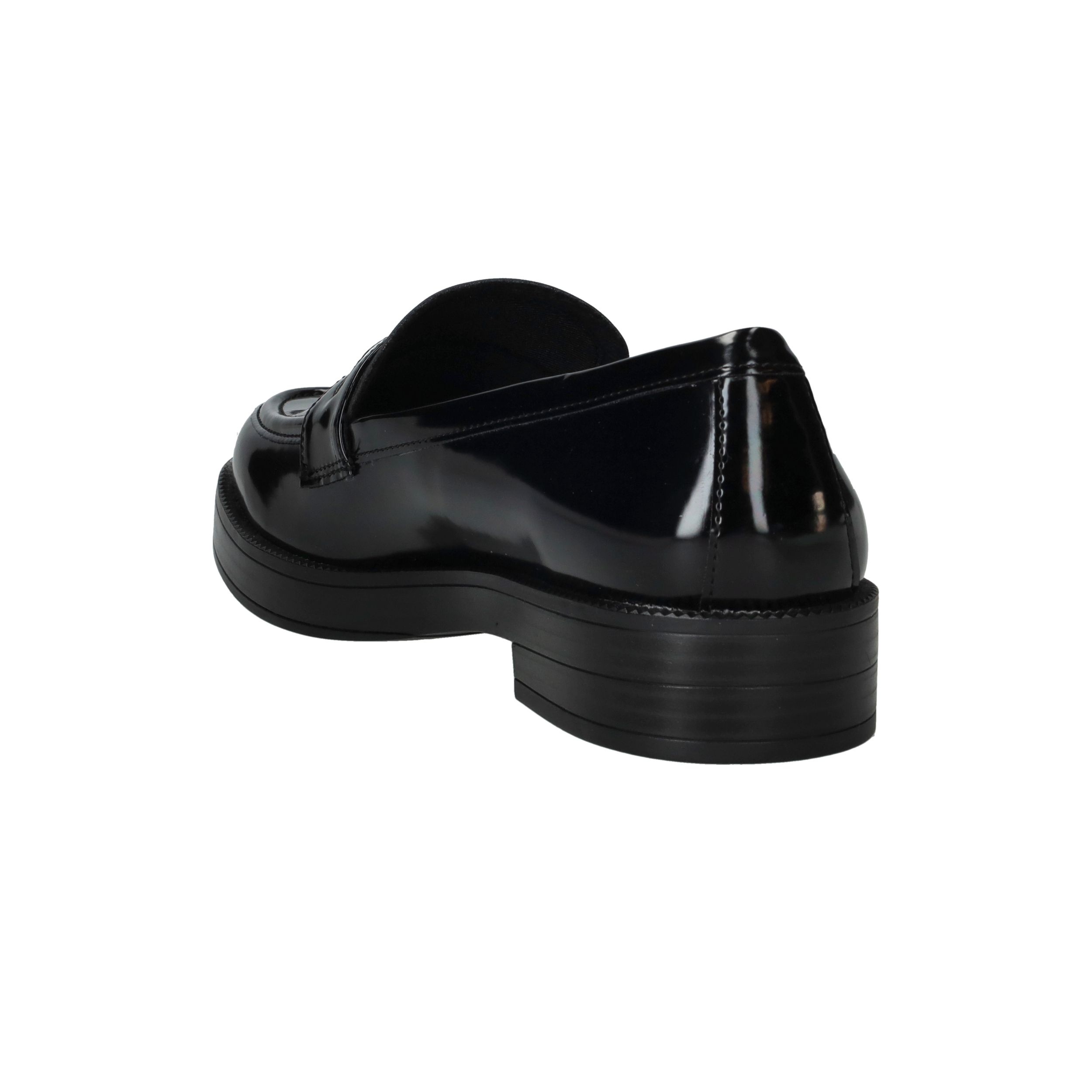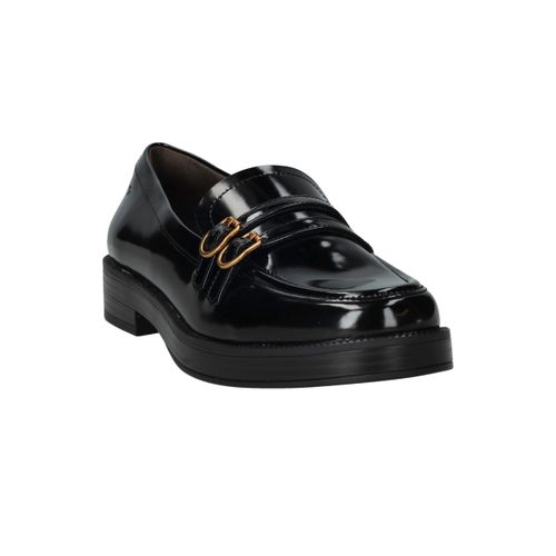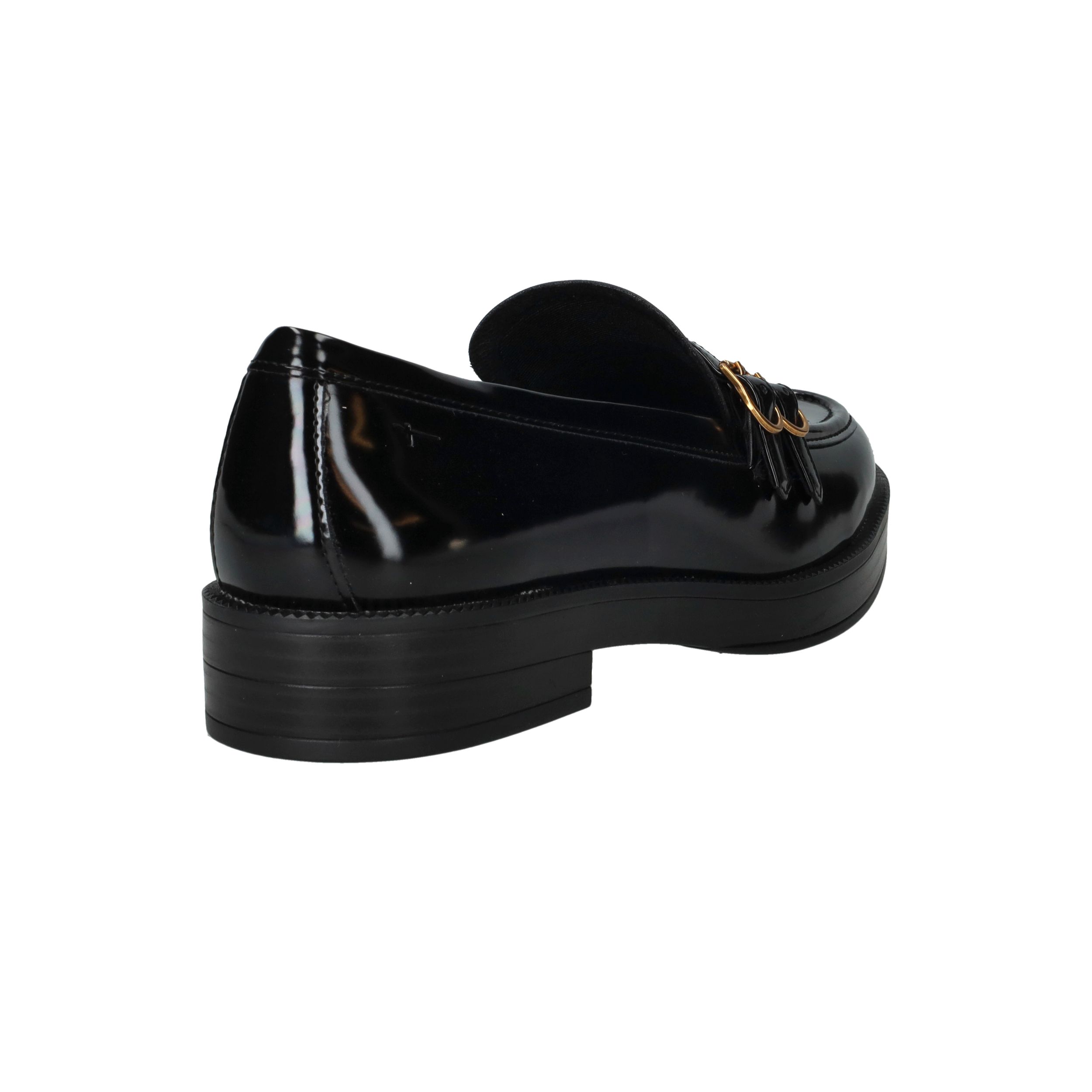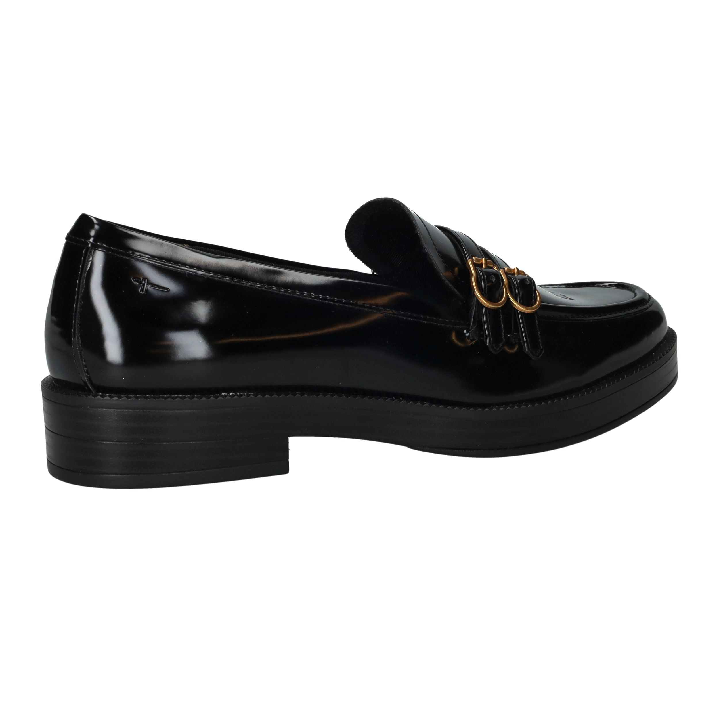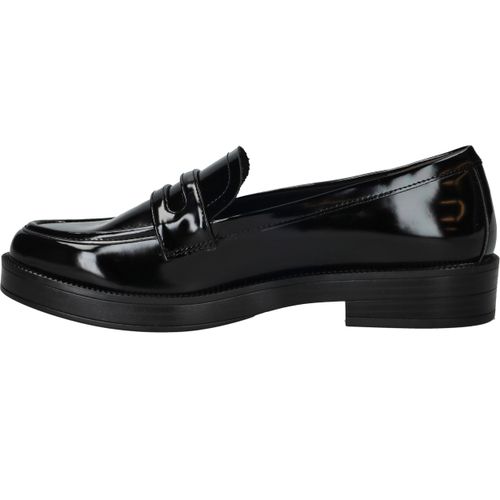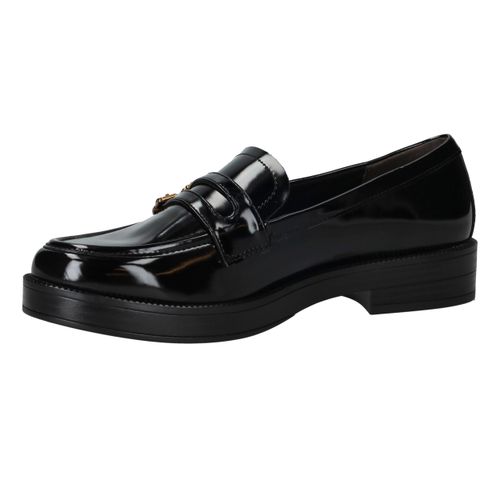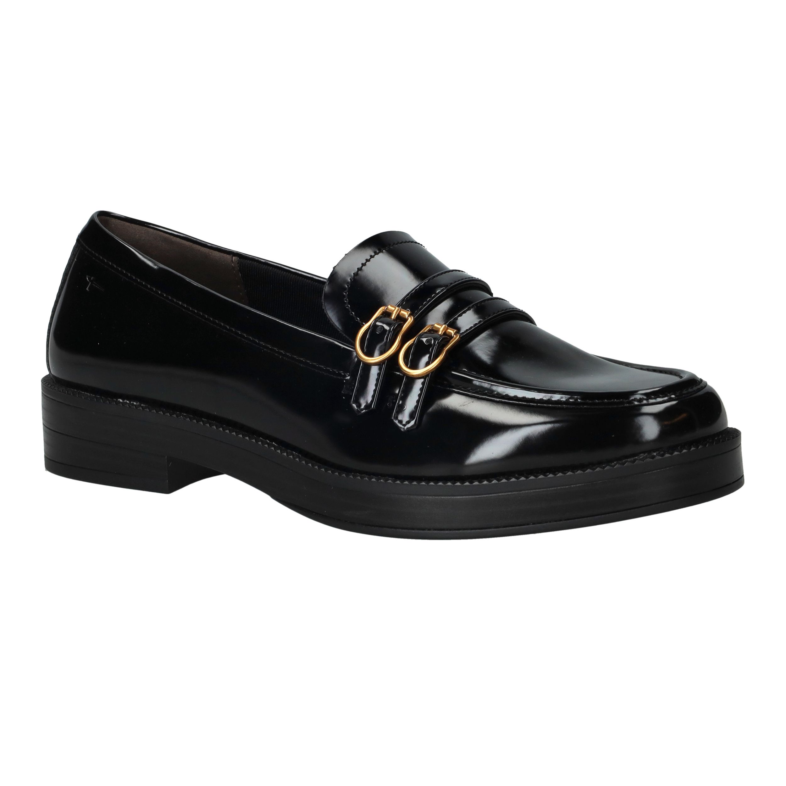 Deze zwarte Tamaris instappers zijn de perfecte mix van elegantie en comfort. De glanzende afwerking en de goudkleurige gespen geven deze loafer een luxe uitstraling die moeiteloos past bij elke outfit, van zakelijk tot casual chic. Ze zijn gemaakt van kunstleer en hebben een zachte synthetische voering, waardoor ze fijn aanvoelen en makkelijk in onderhoud zijn. De voetbreedte G zorgt voor een comfortabele pasvorm.