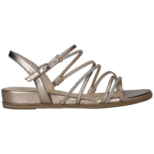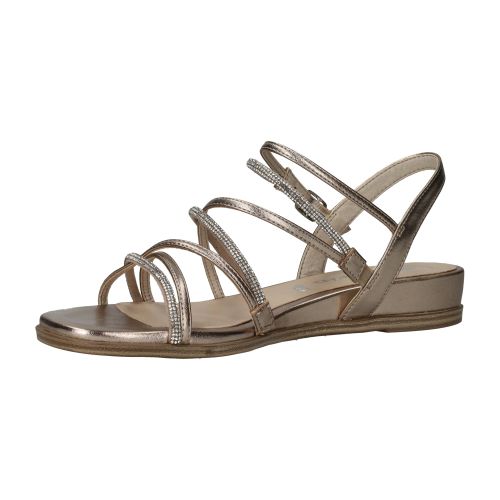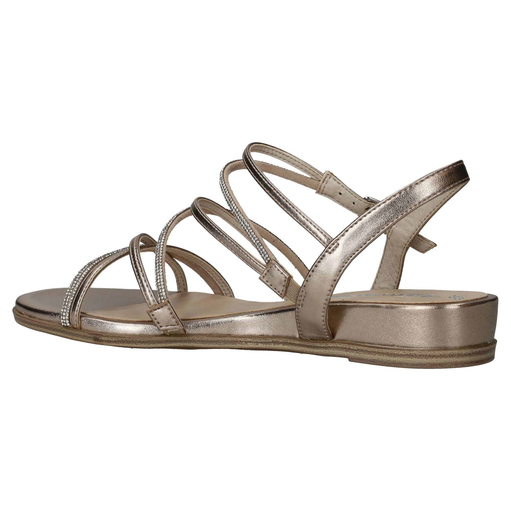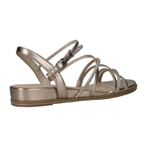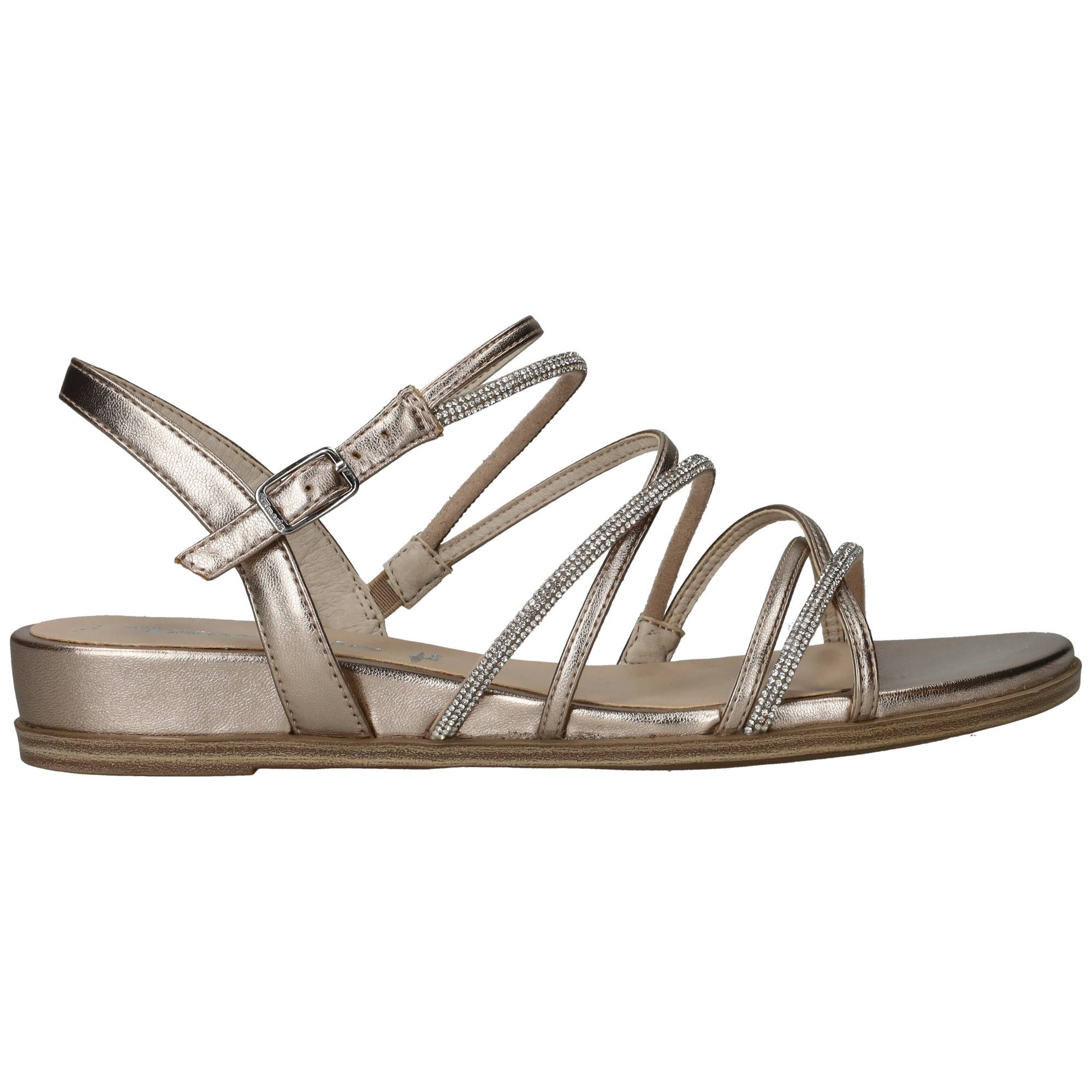 Elegante Tamaris sandaal in het lichtgoud. De sandaal heeft glinsterende steentjes op de bandjes.