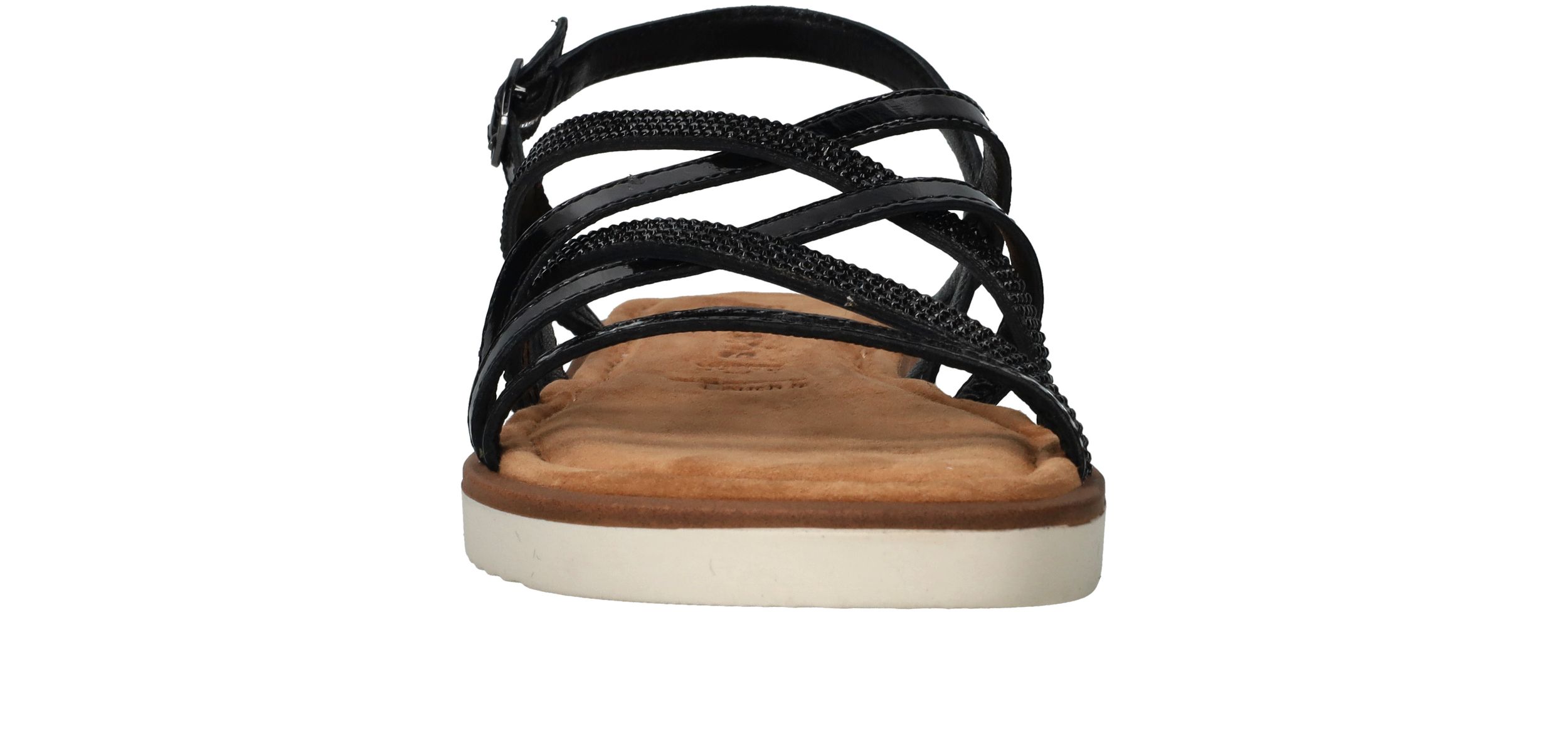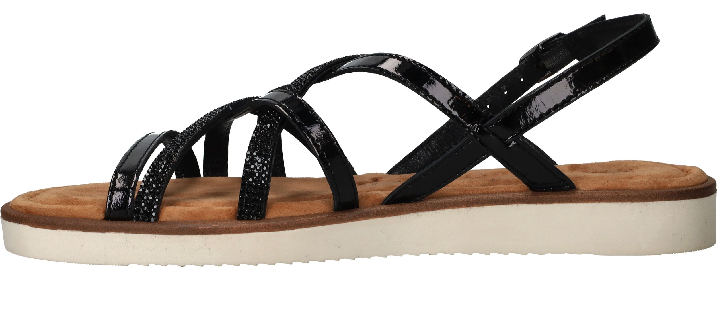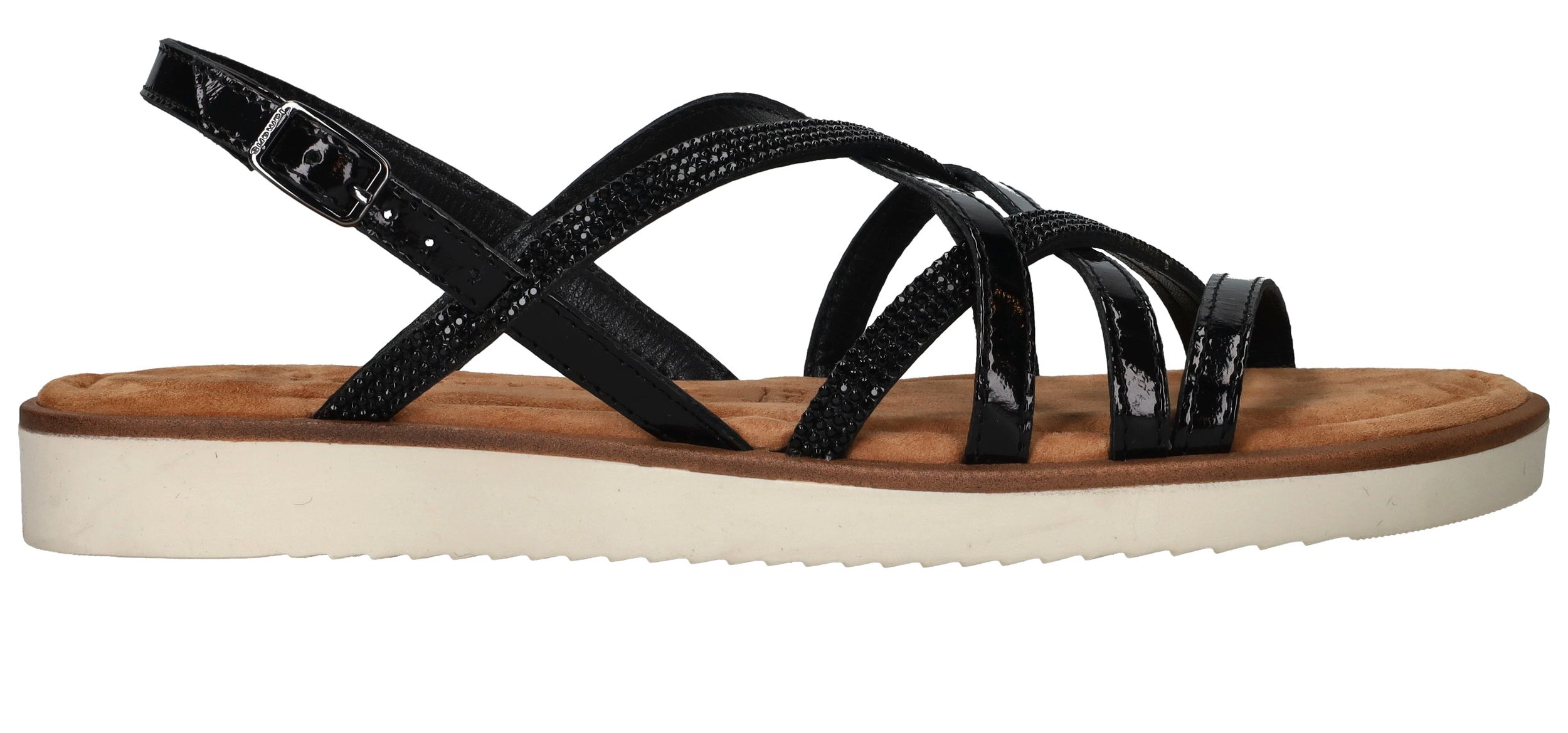 Fijne zwarte Tamaris sandaal voor dames. De zwarte glittersteentjes maken de schoen helemaal af!