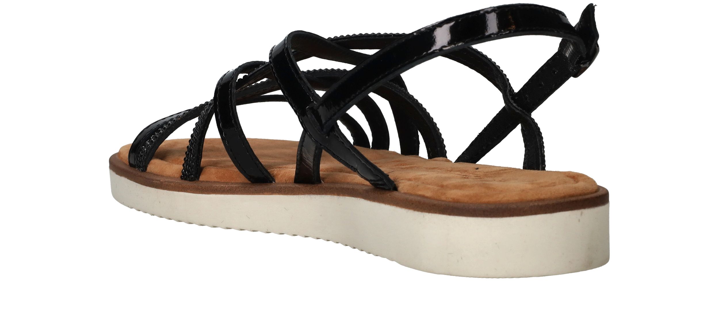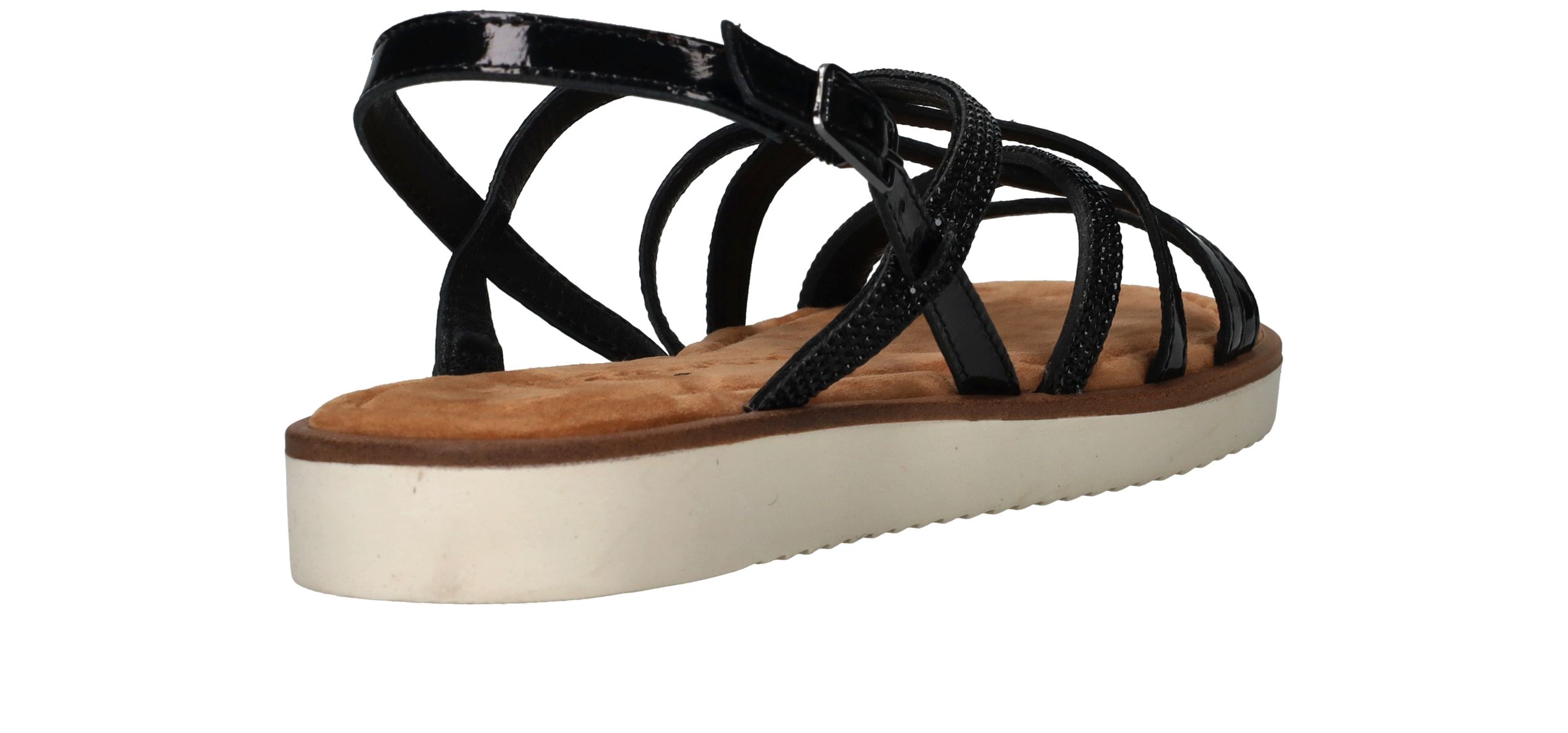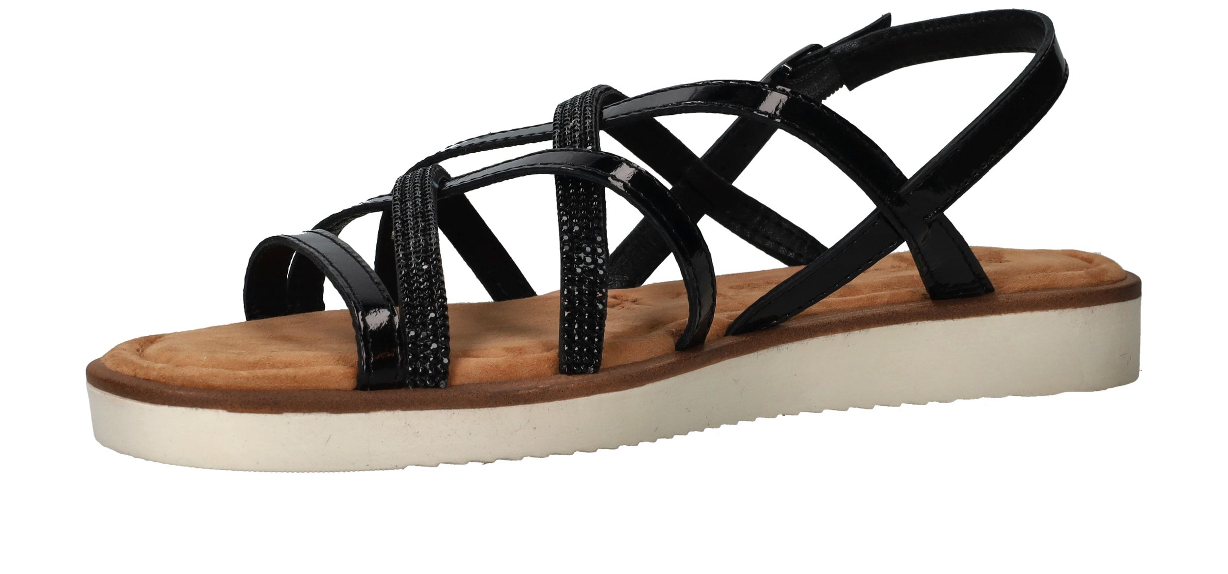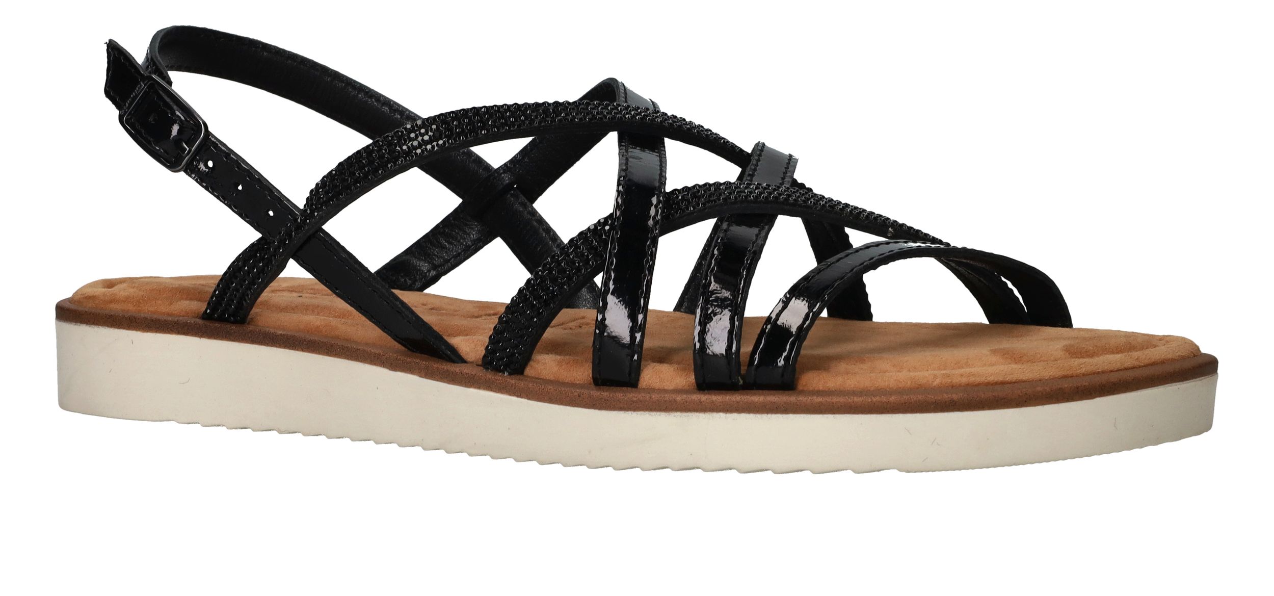 Fijne zwarte Tamaris sandaal voor dames. De zwarte glittersteentjes maken de schoen helemaal af!