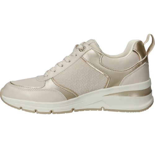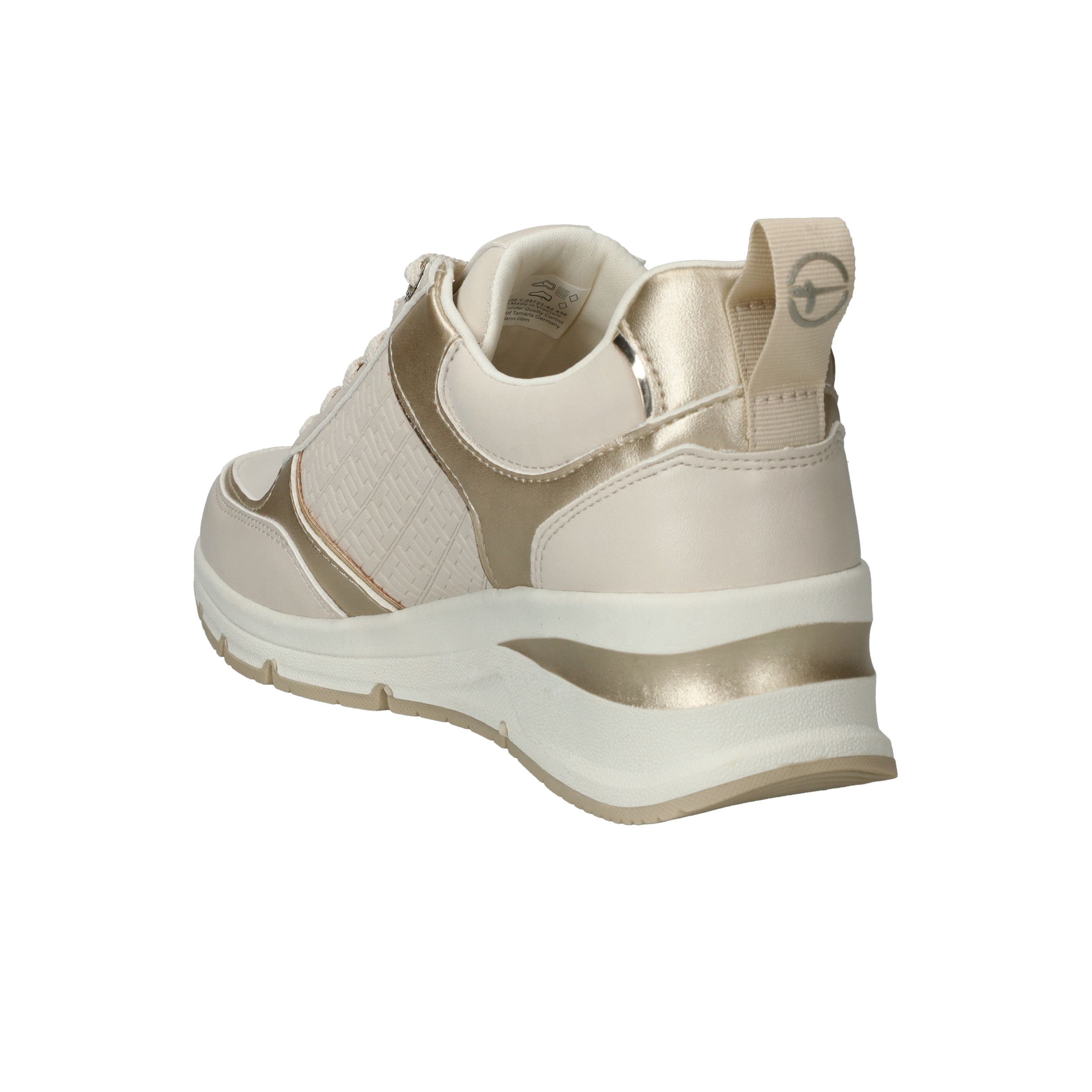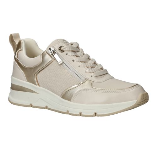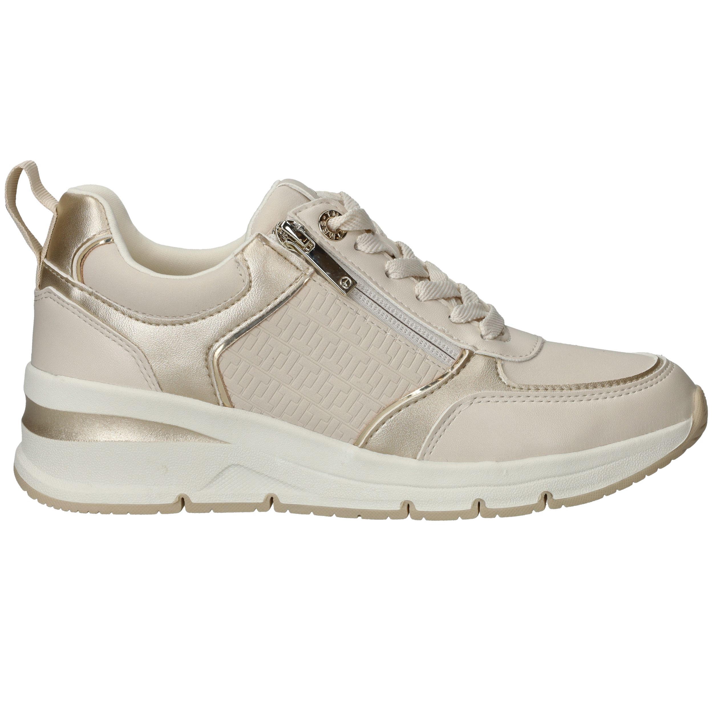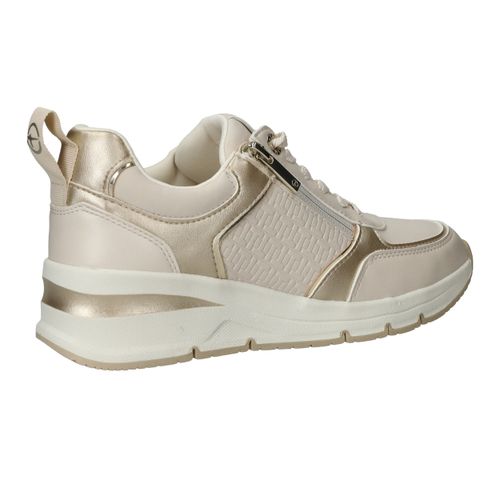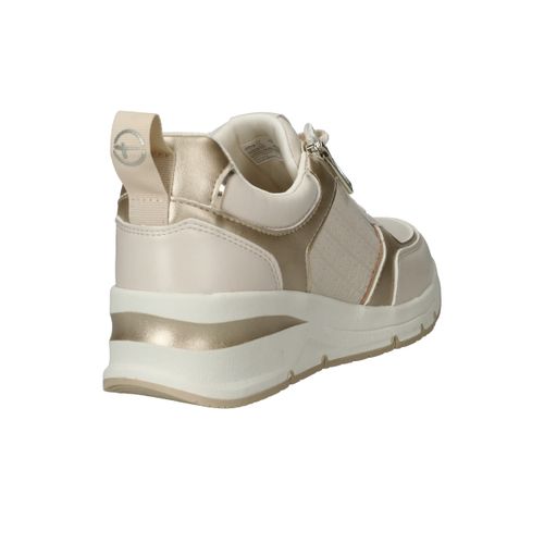 Stijlvolle en comfortabele Tamaris sneaker voor dames. De sneaker heeft een warme beige kleur met metallic gouden accenten.