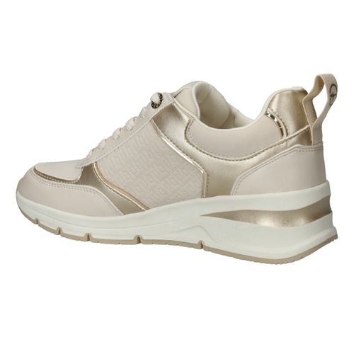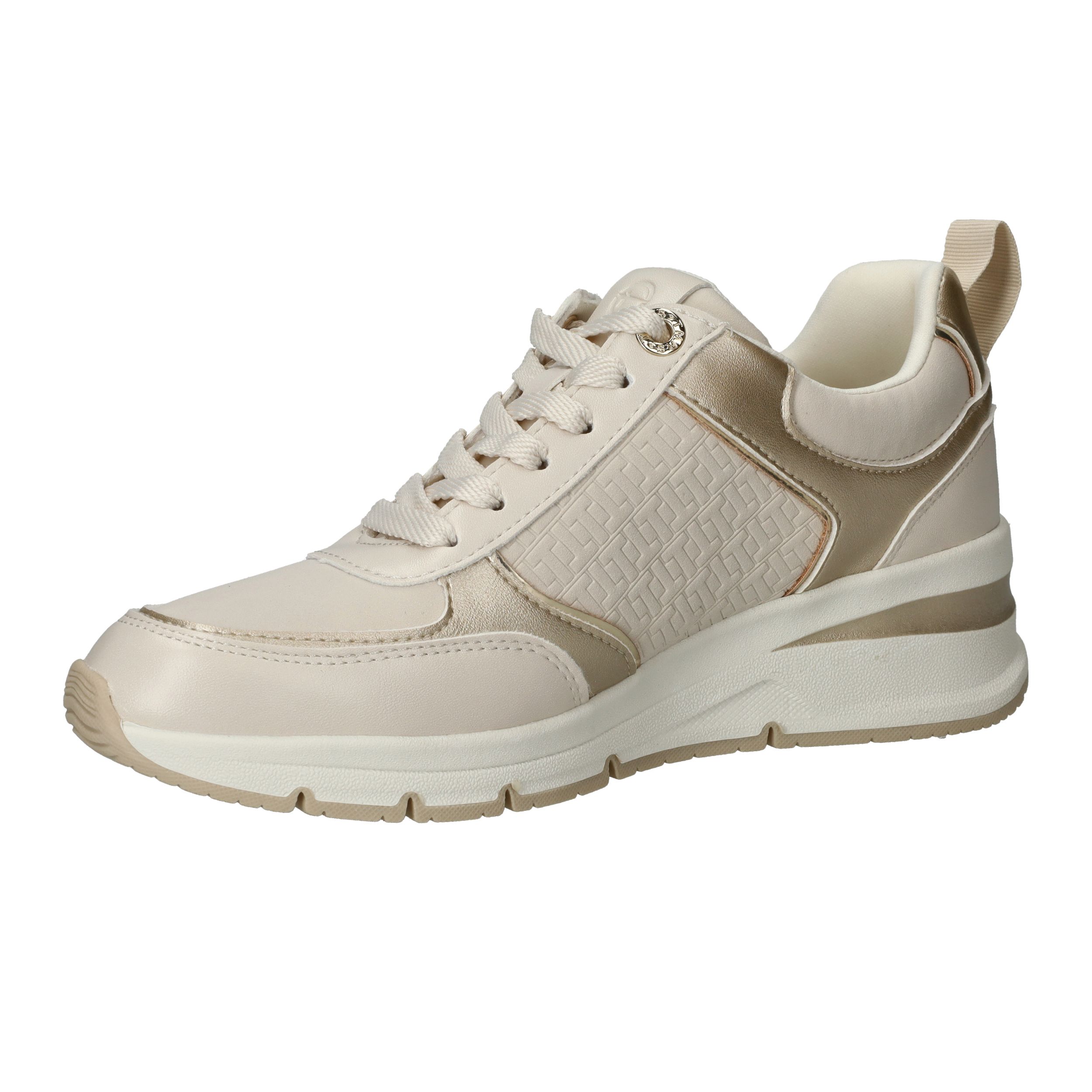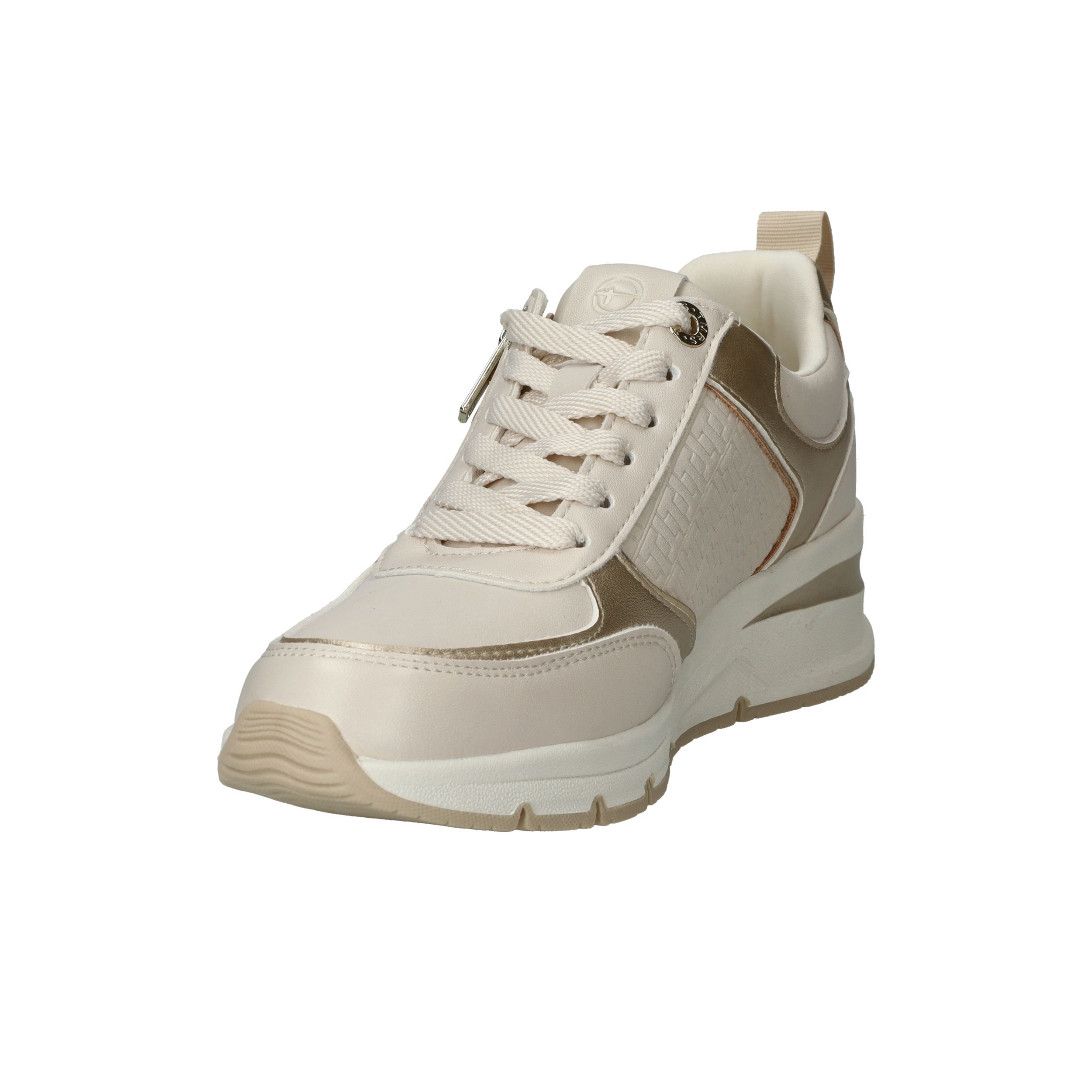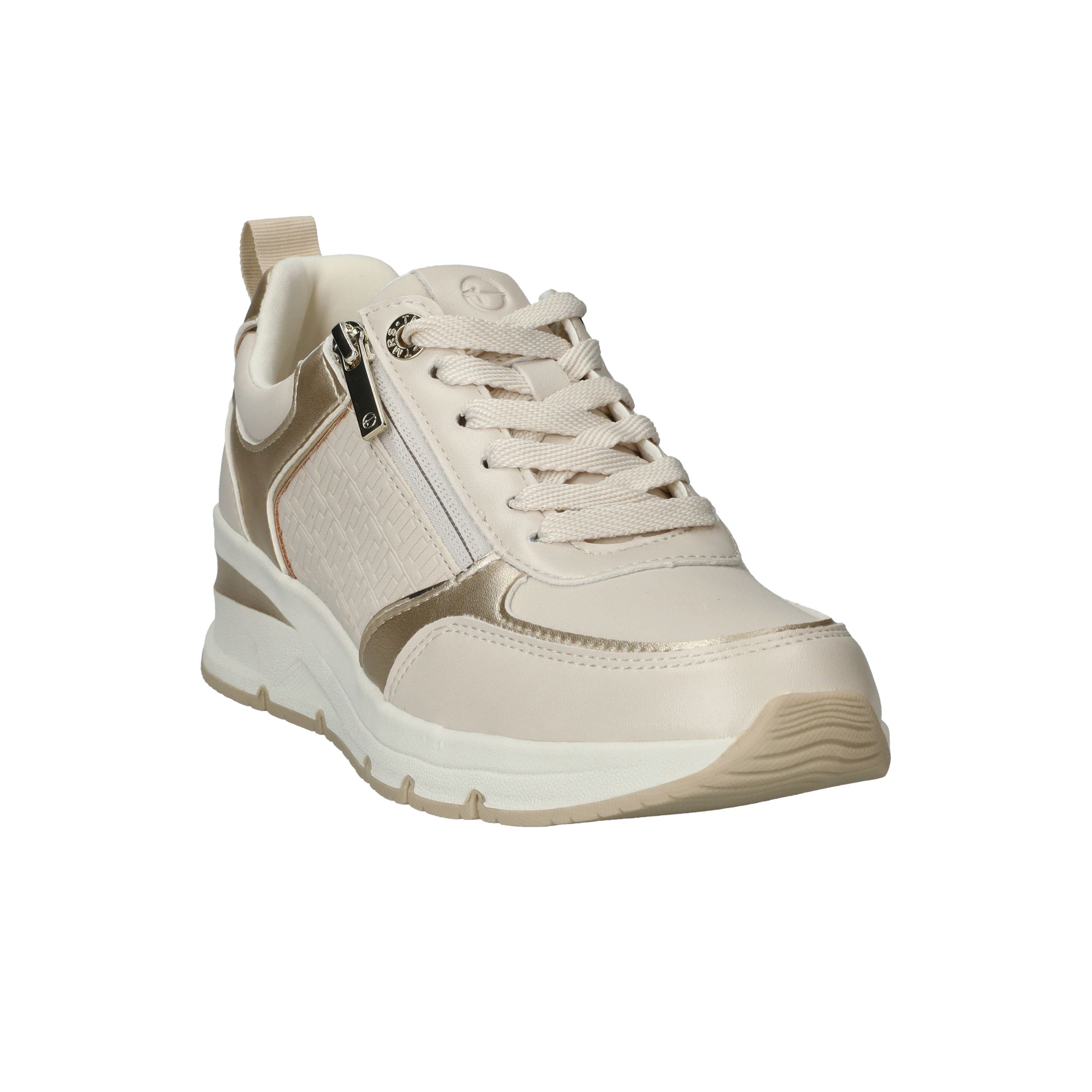 Stijlvolle en comfortabele Tamaris sneaker voor dames. De sneaker heeft een warme beige kleur met metallic gouden accenten.
