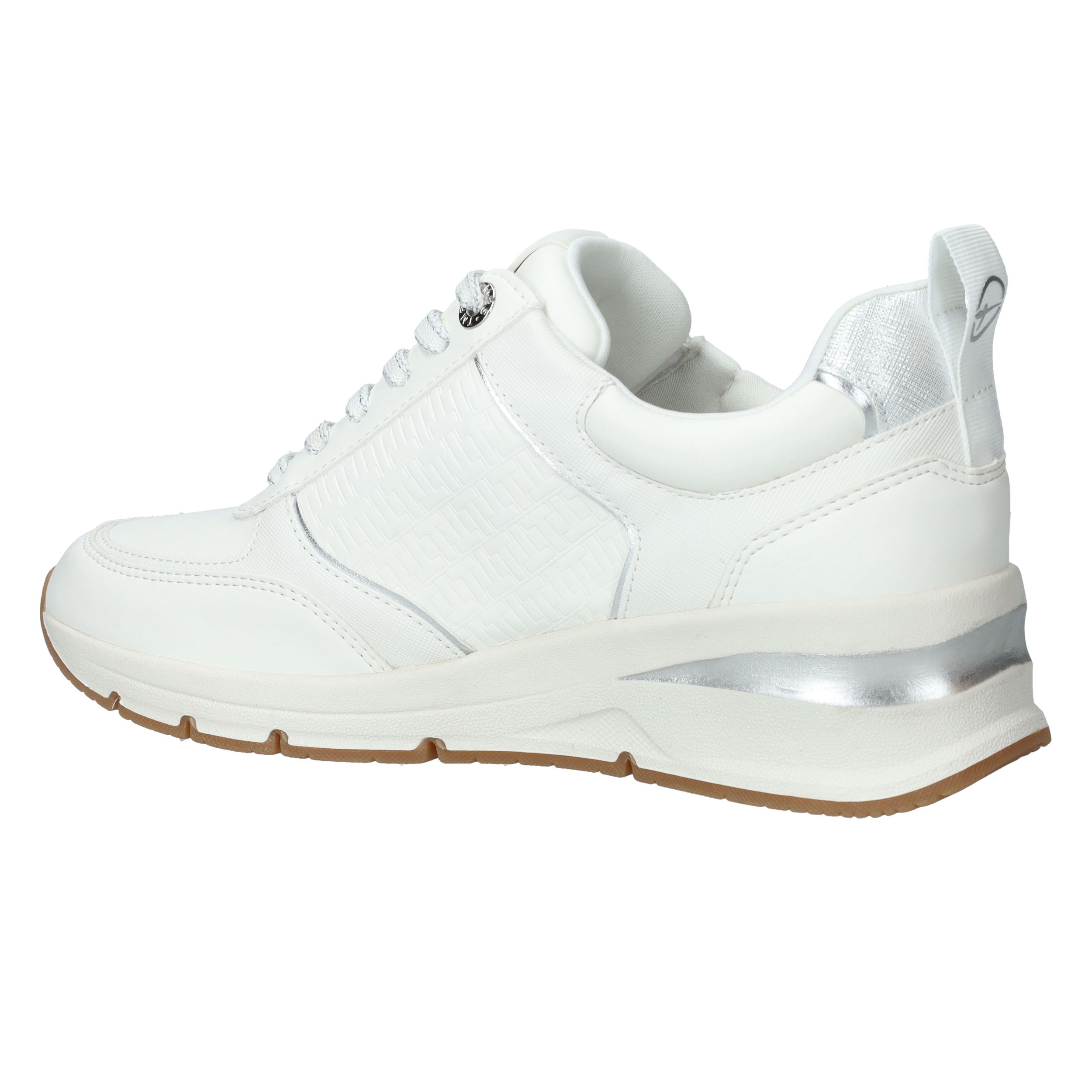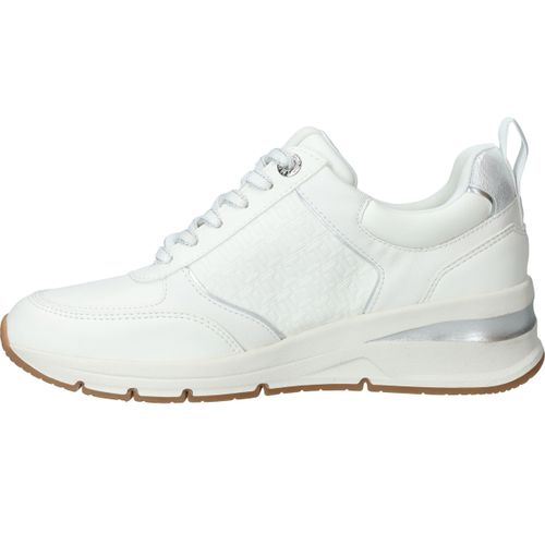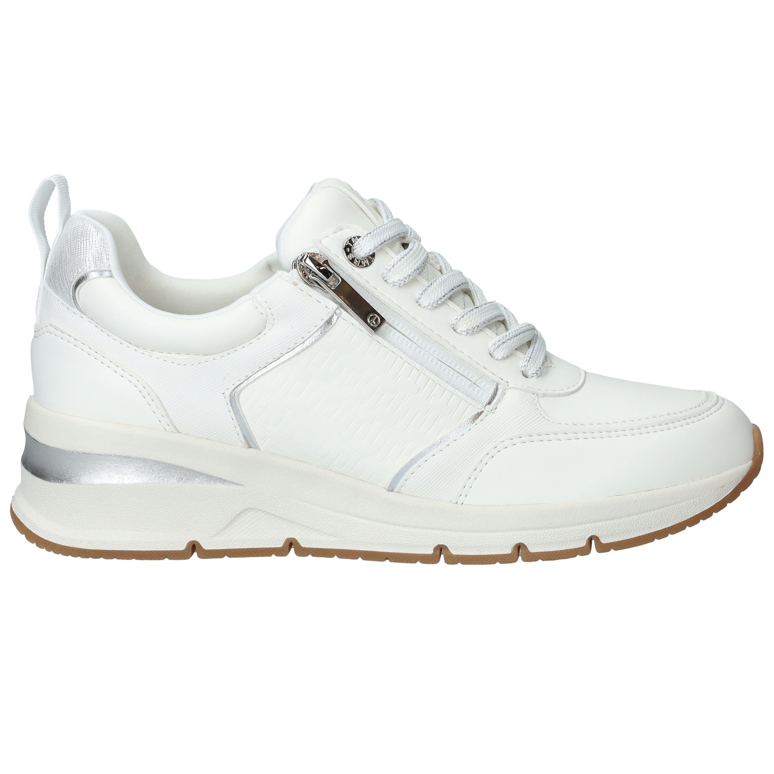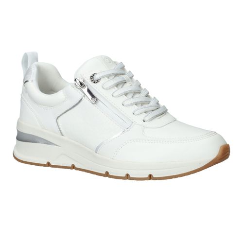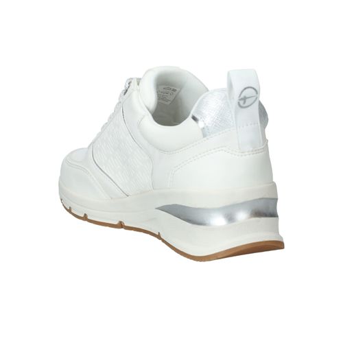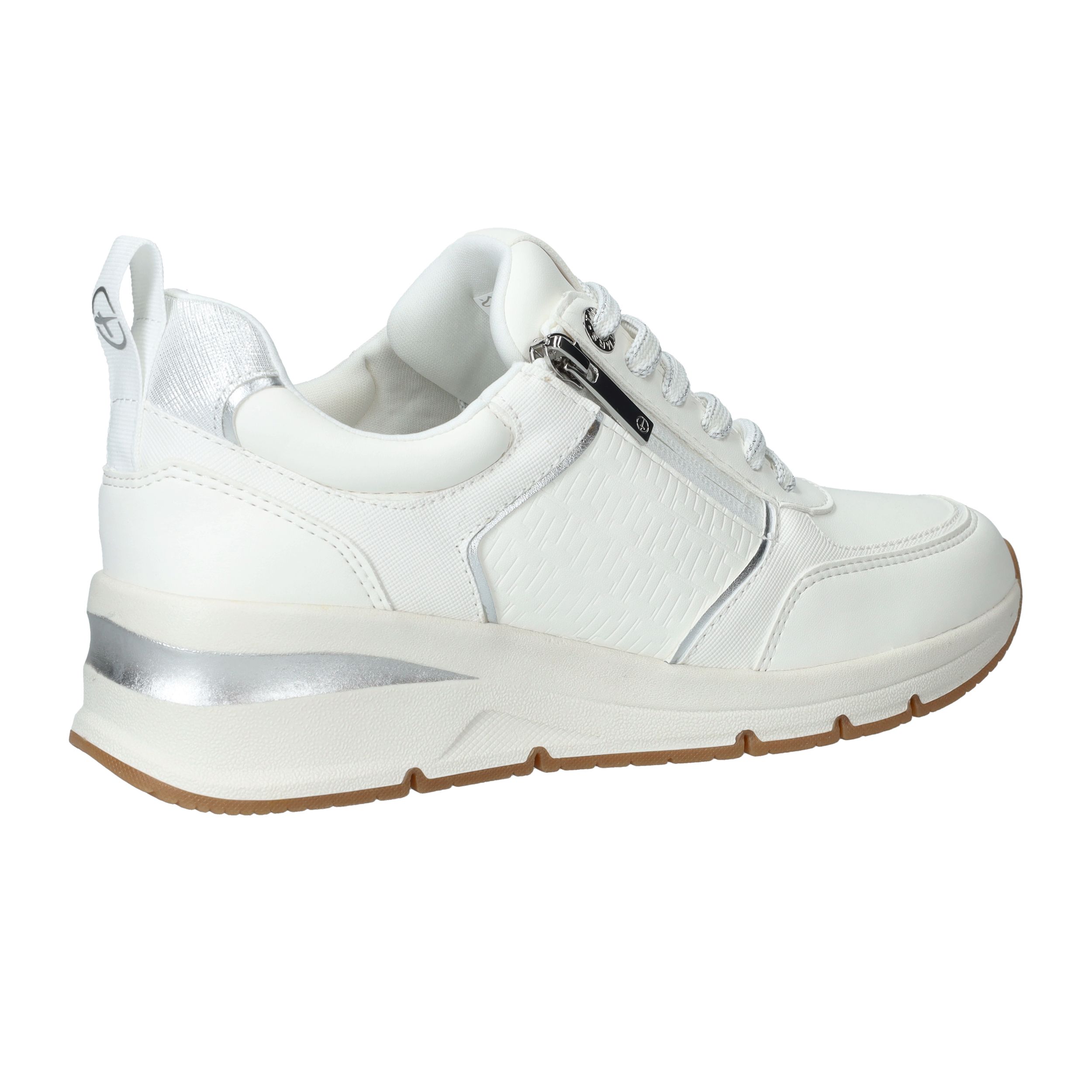 Mooie witte Tamaris sneaker met zilveren accenten en sportieve zool.