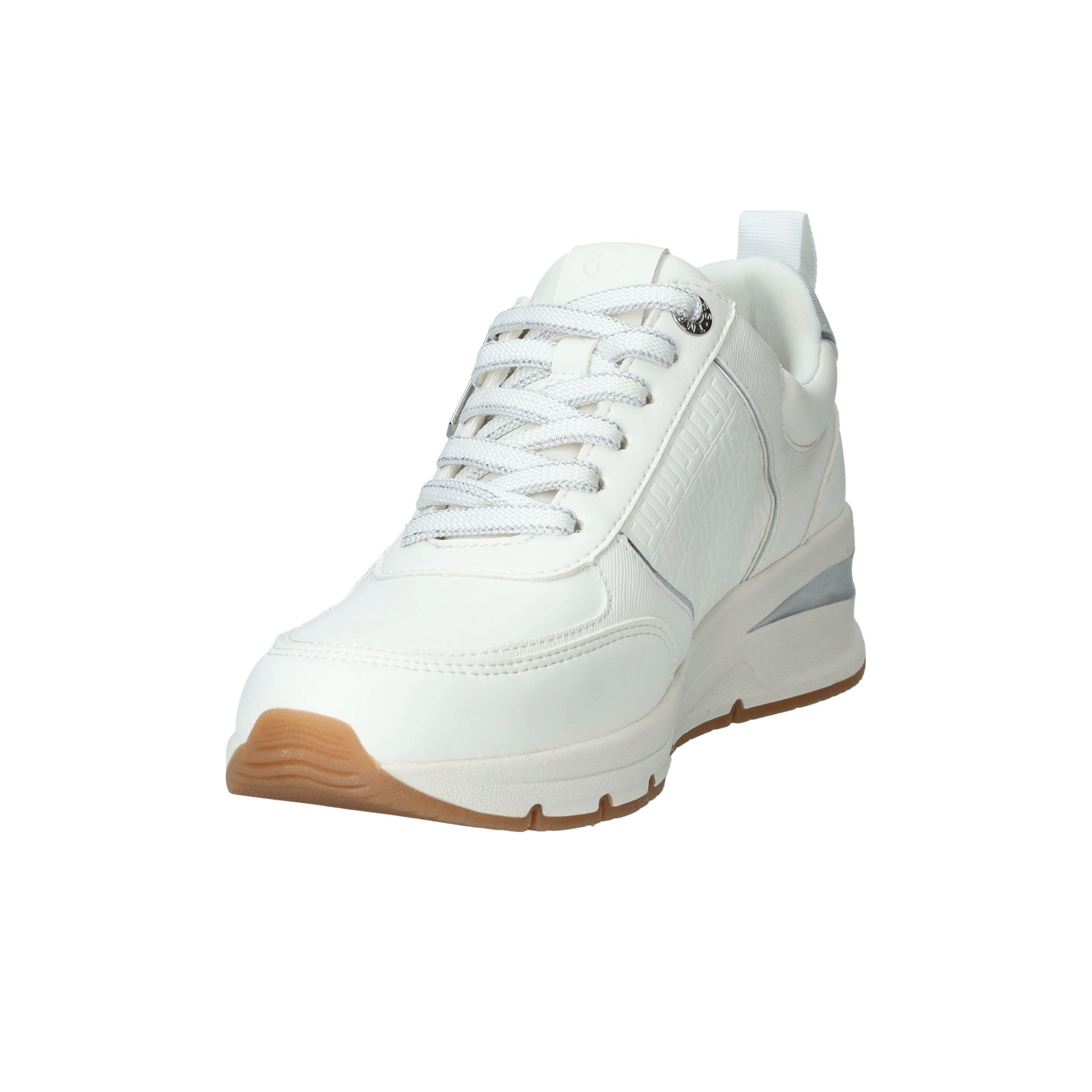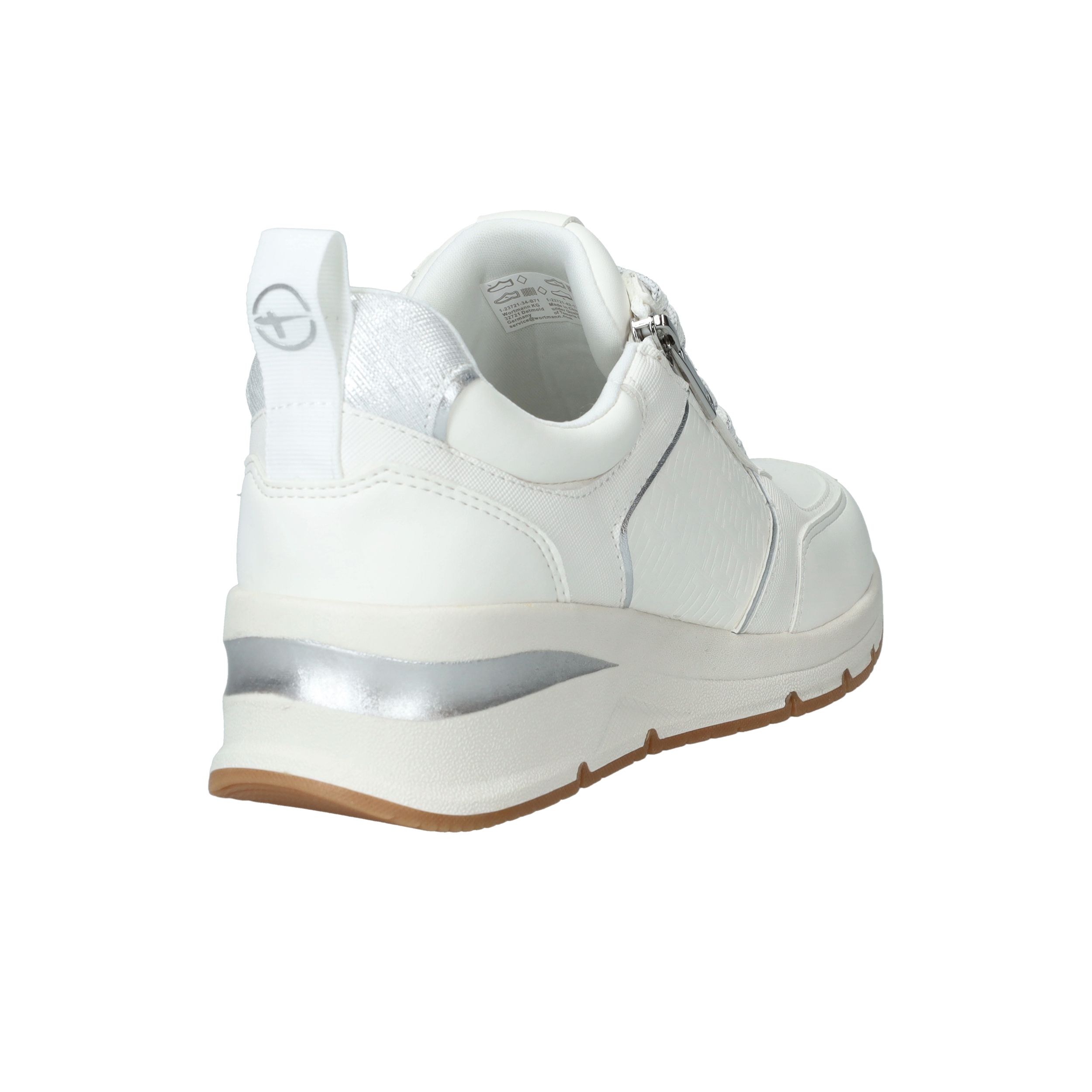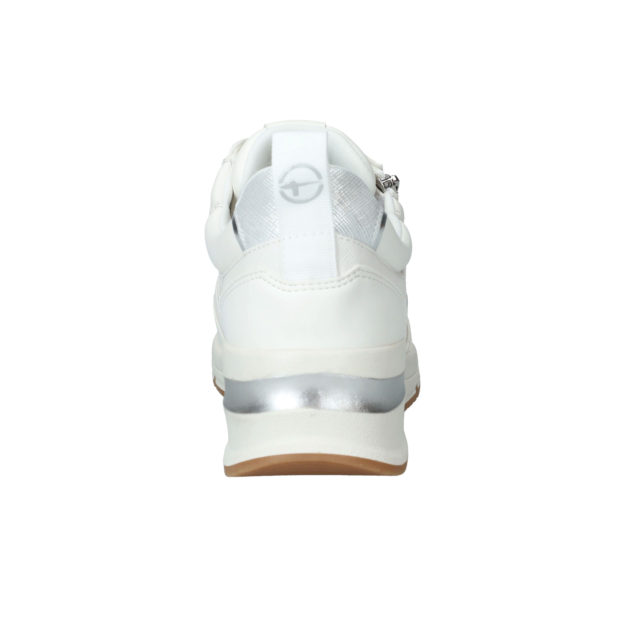 Mooie witte Tamaris sneaker met zilveren accenten en sportieve zool.