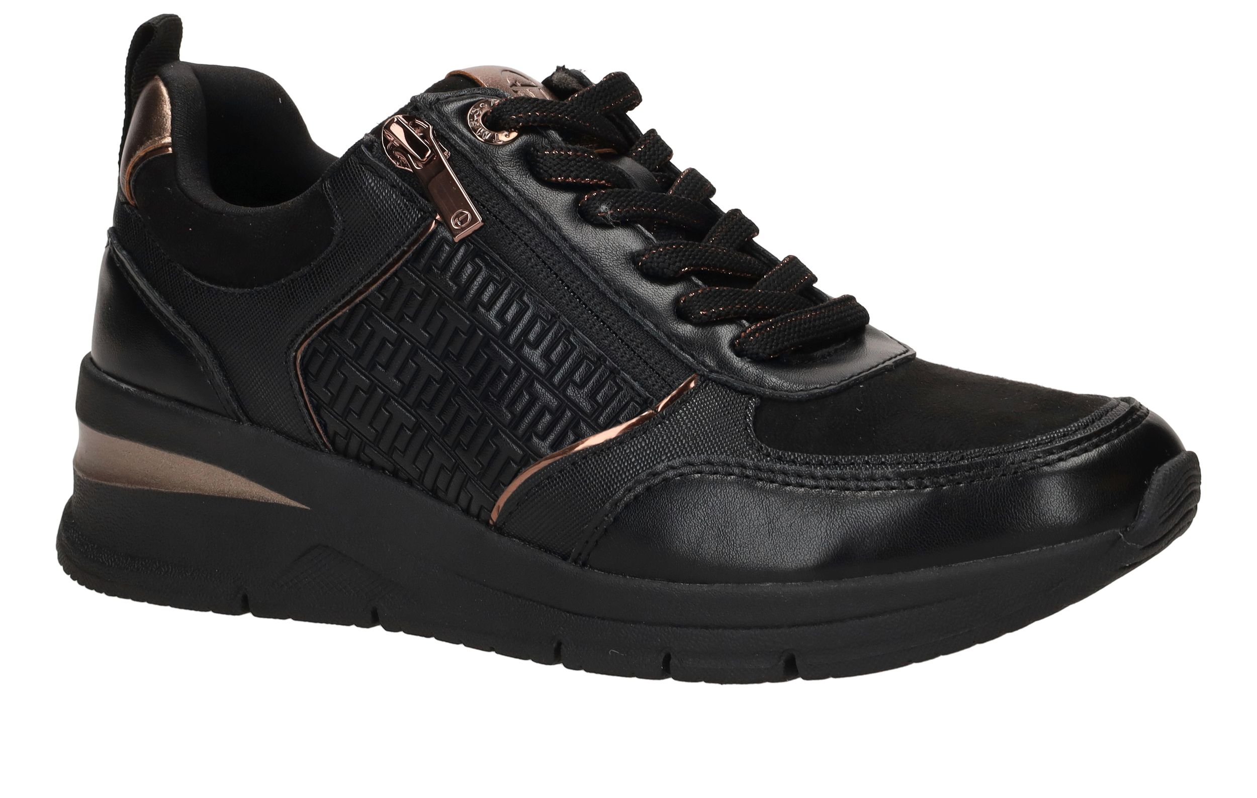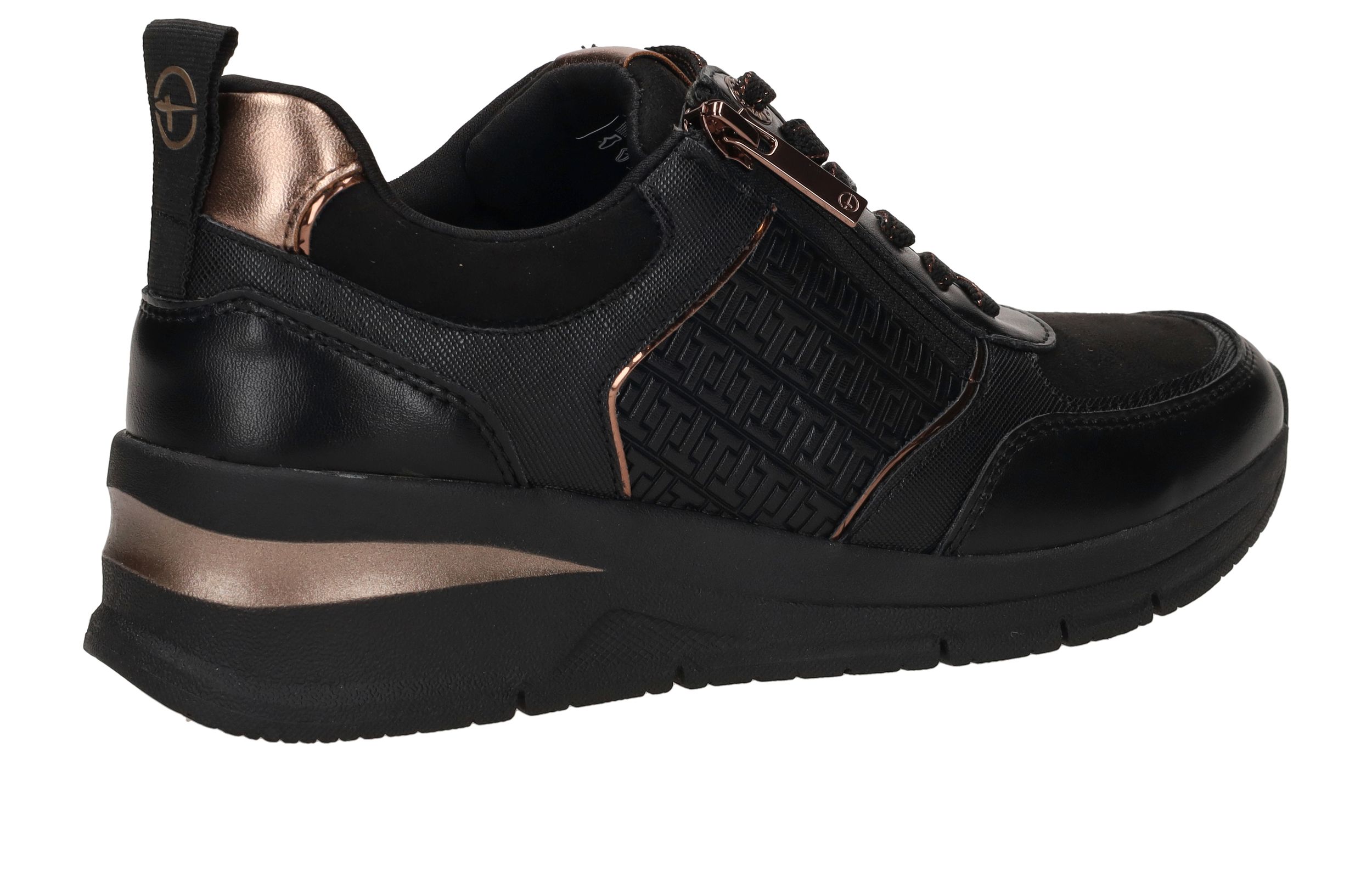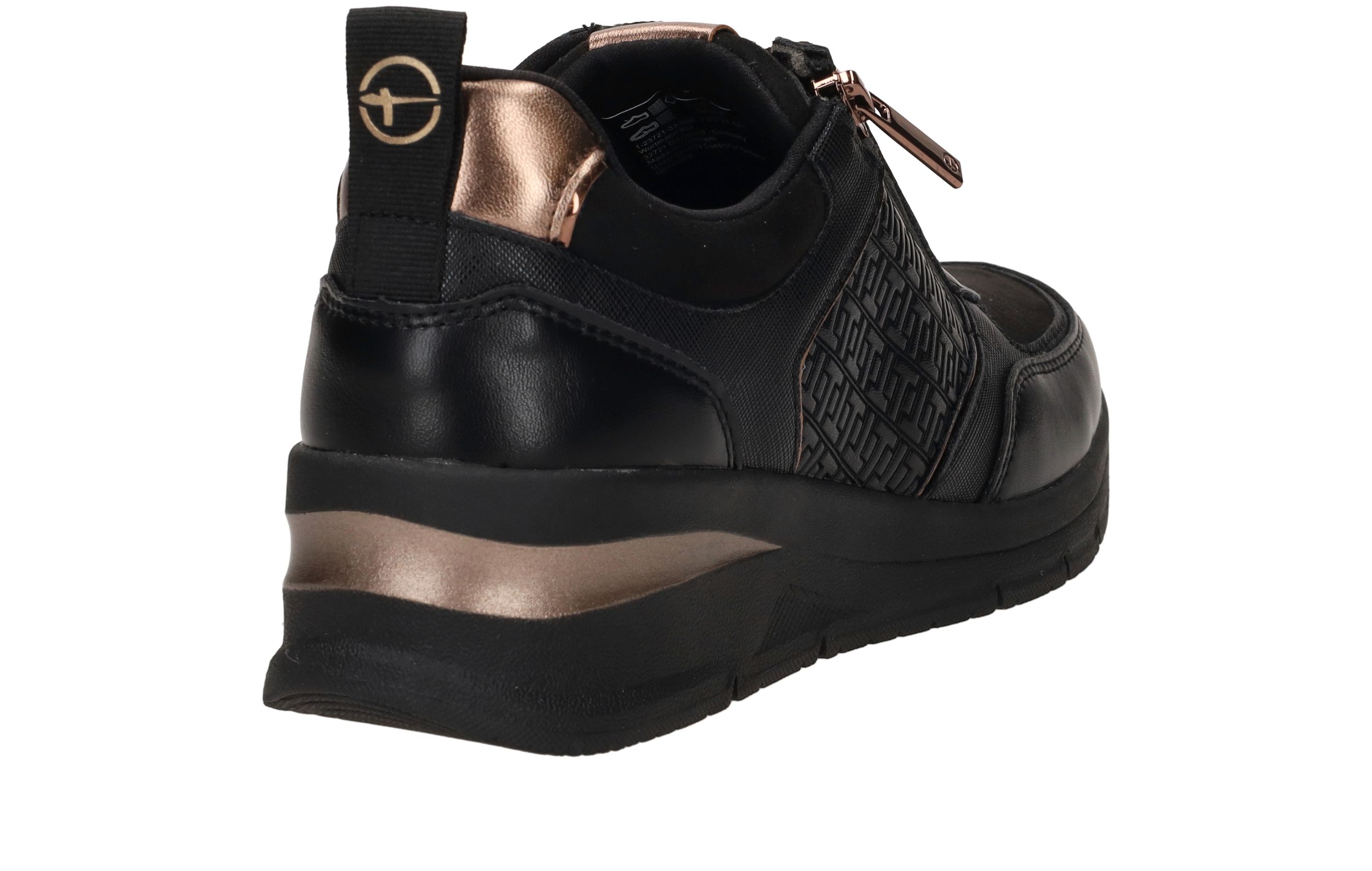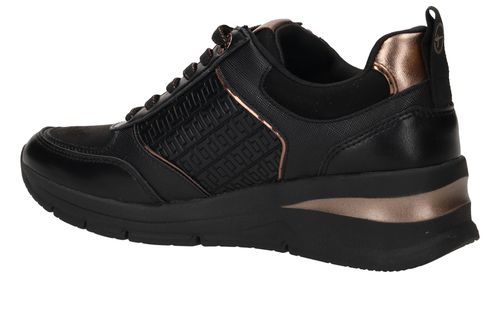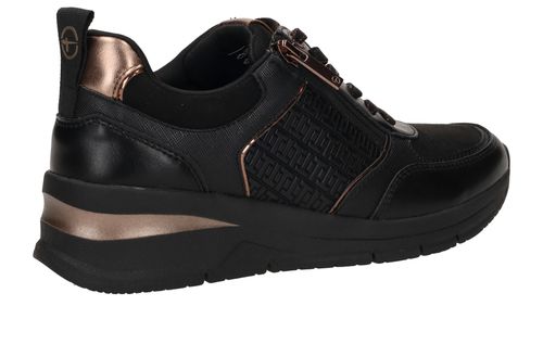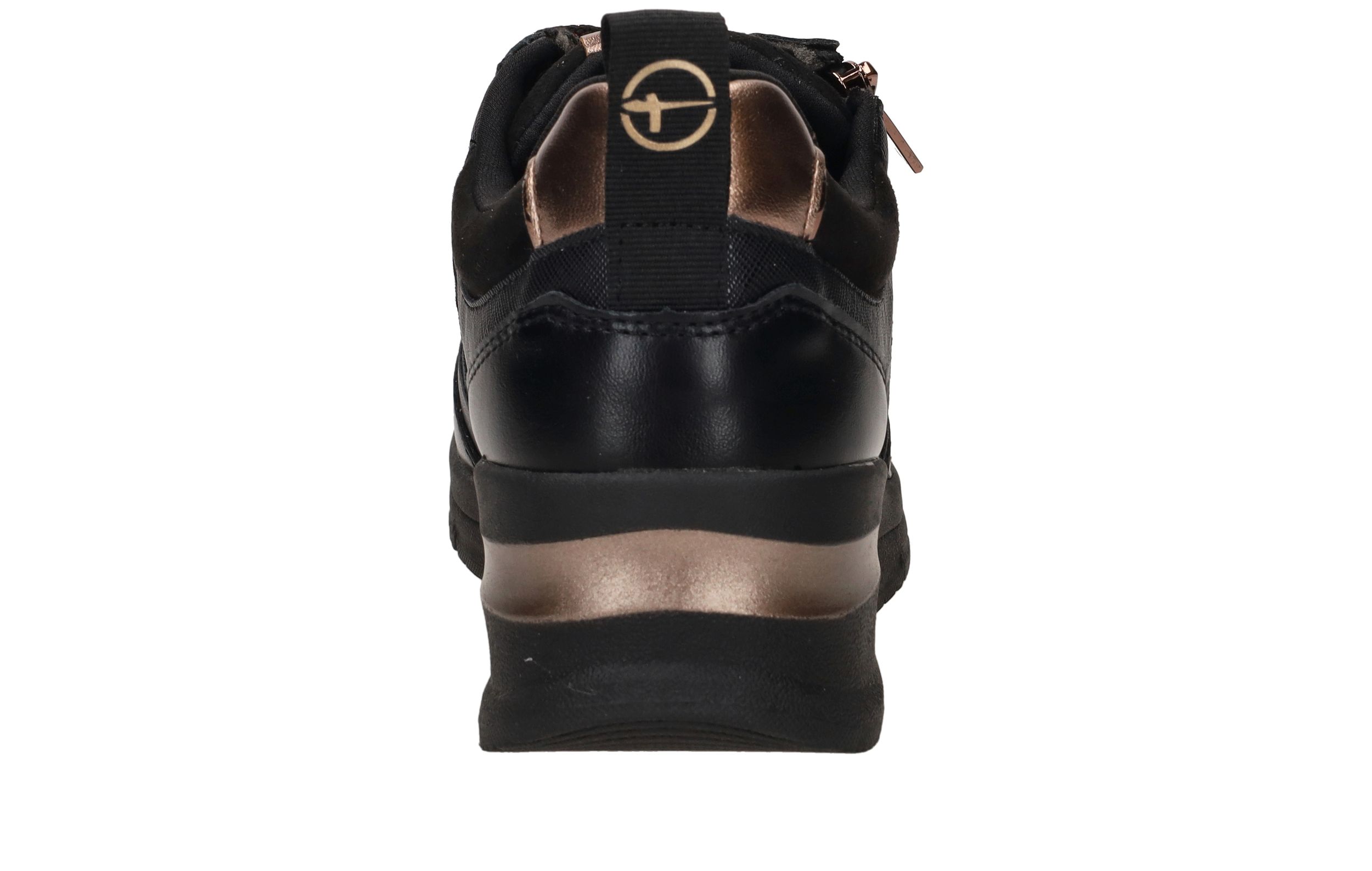 Mooie zwarte Tamaris sneaker voor dames met stijlvolle metallic roségouden accenten! De sneakers zijn helemaal gemaakt van vegan materiaal.