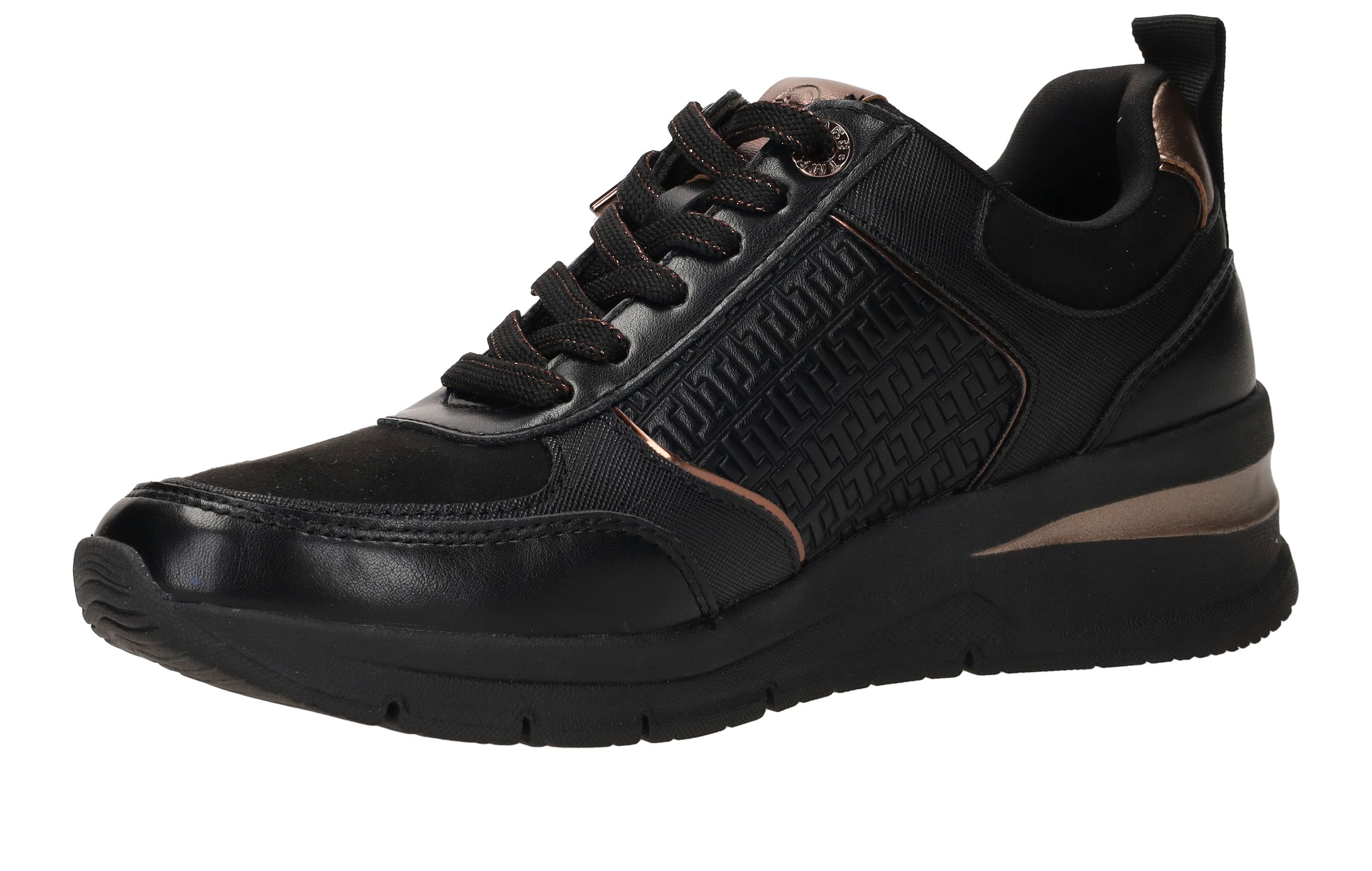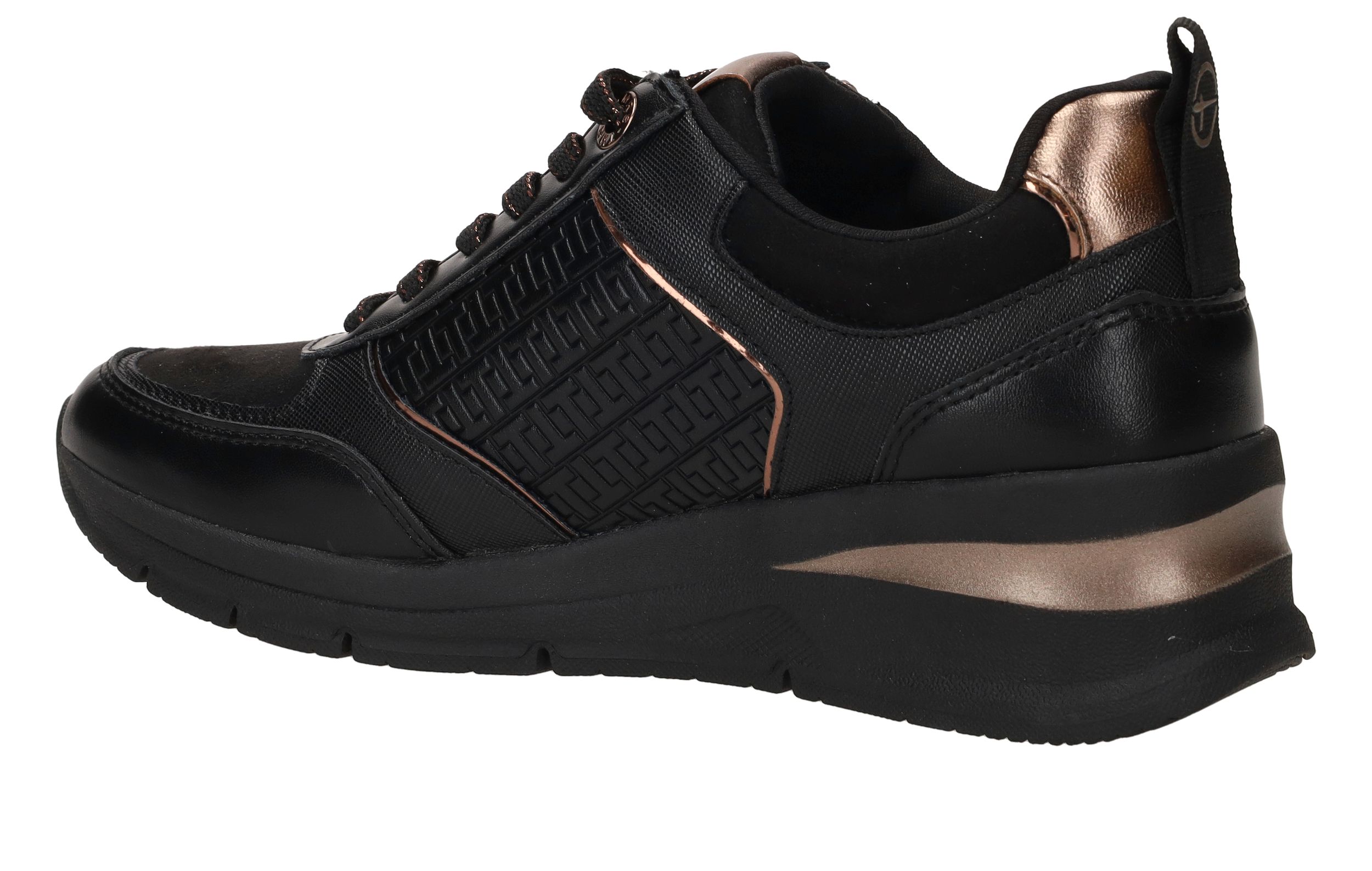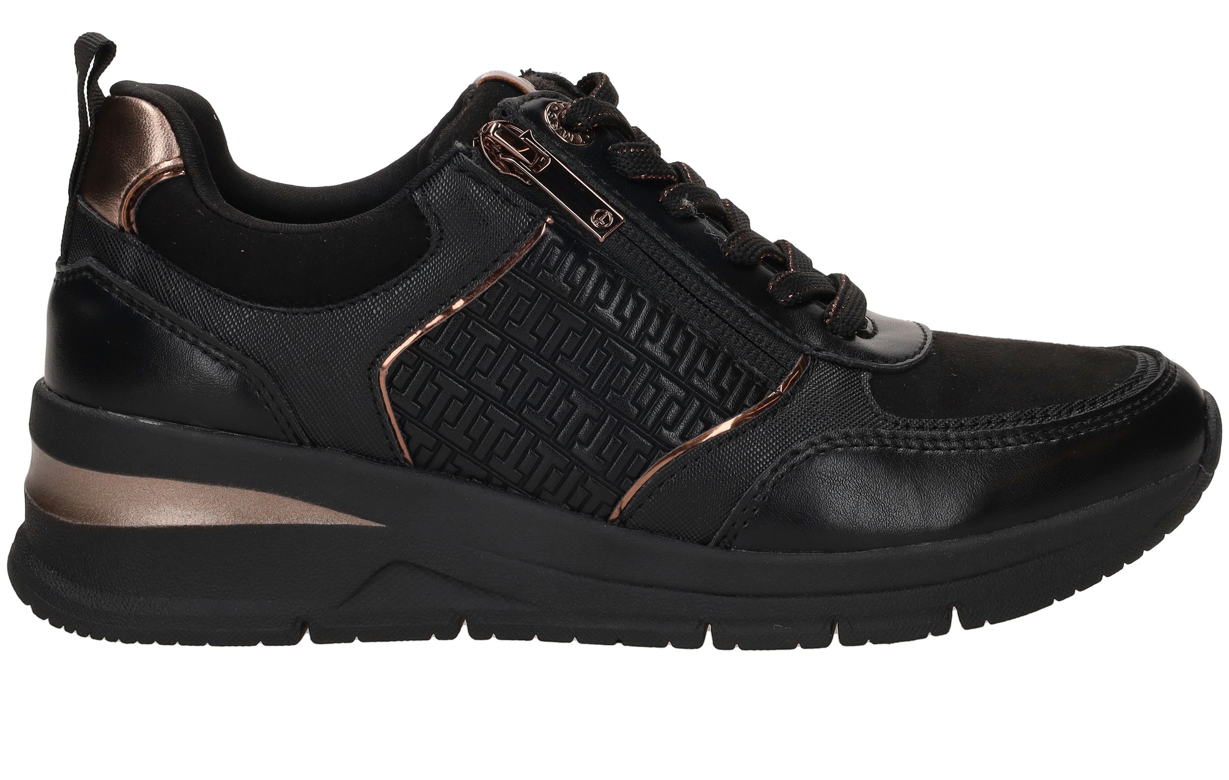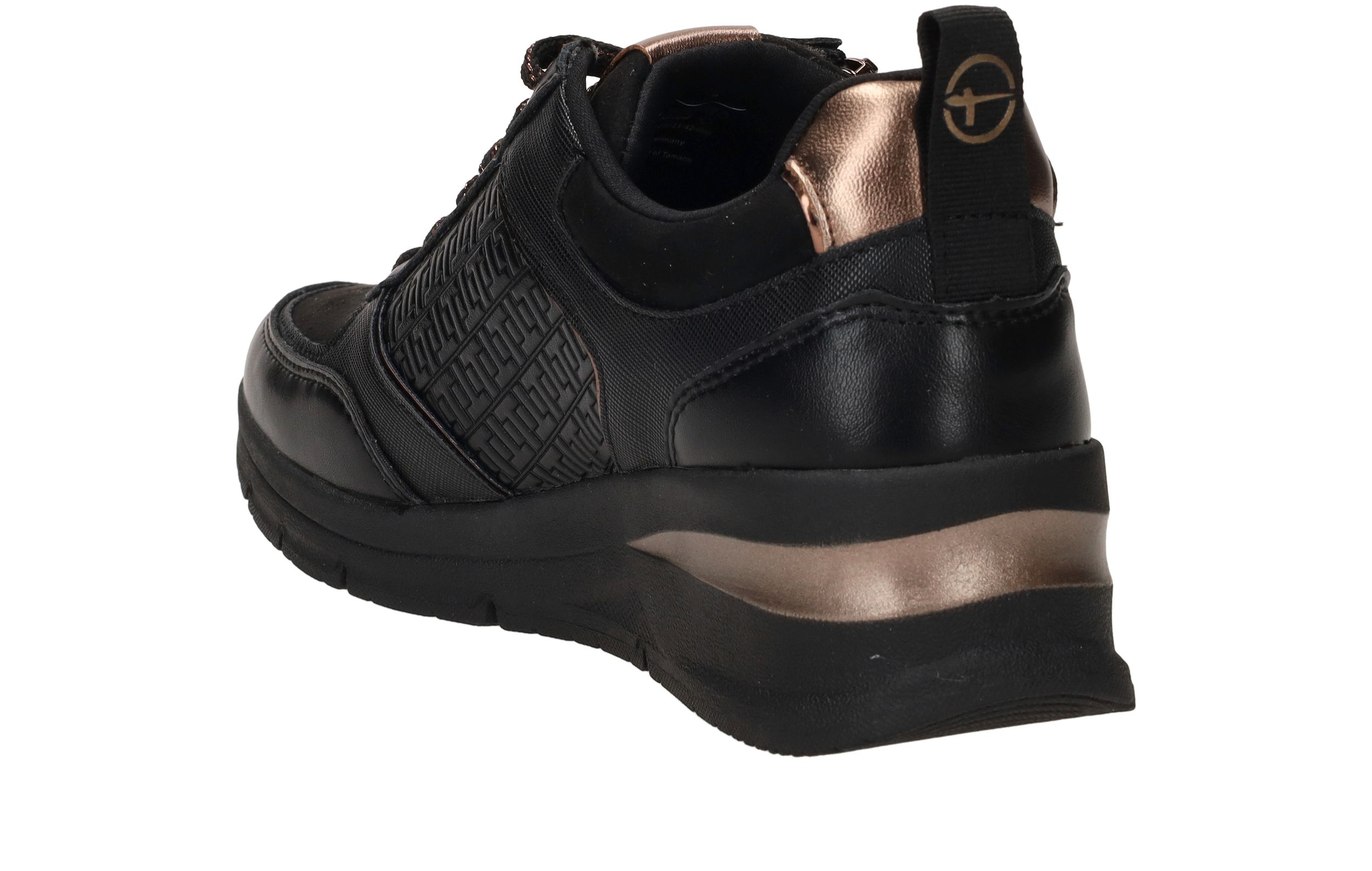 Mooie zwarte Tamaris sneaker voor dames met stijlvolle metallic roségouden accenten! De sneakers zijn helemaal gemaakt van vegan materiaal.