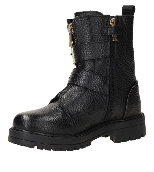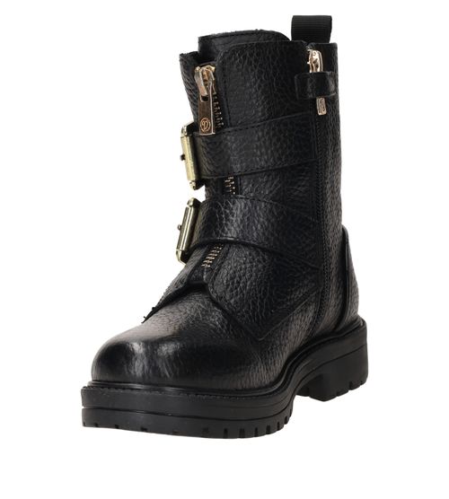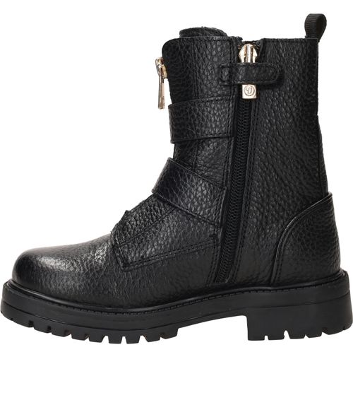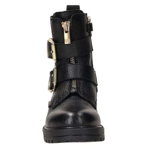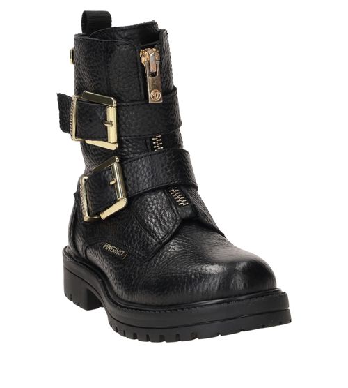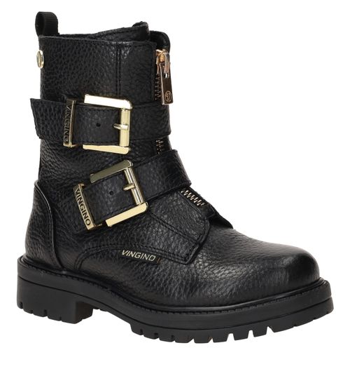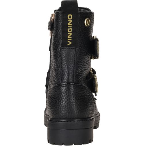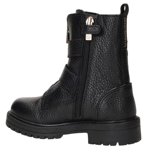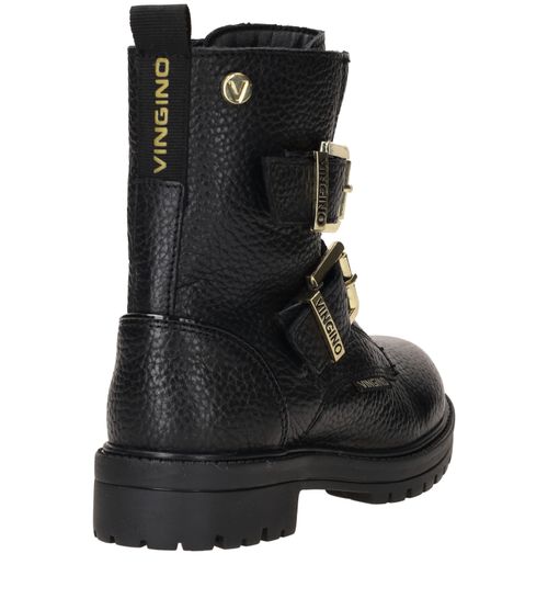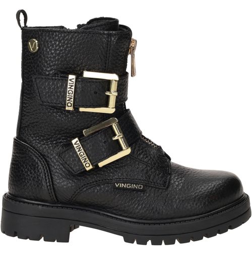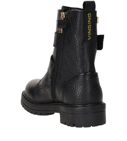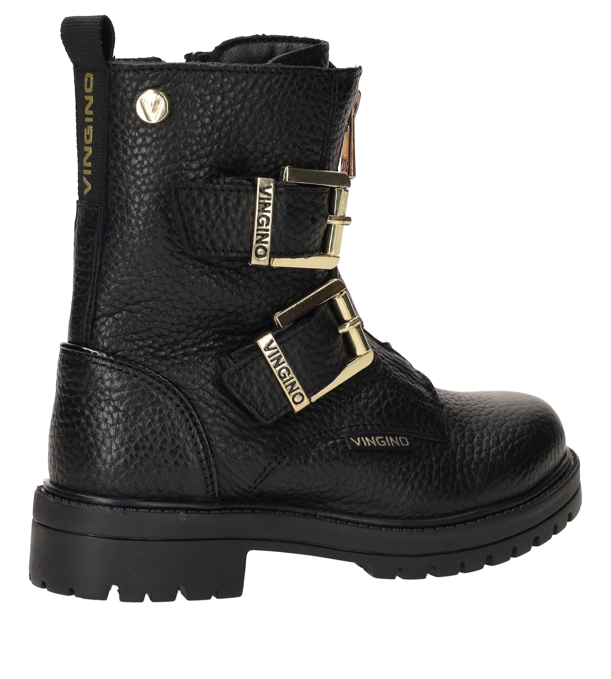 Super stoere Vingino VELIA boot voor meiden. De zwarte bikerboot is gemaakt van leer en is afgewerkt met een sierrits en twee gespen aan de zijkant.