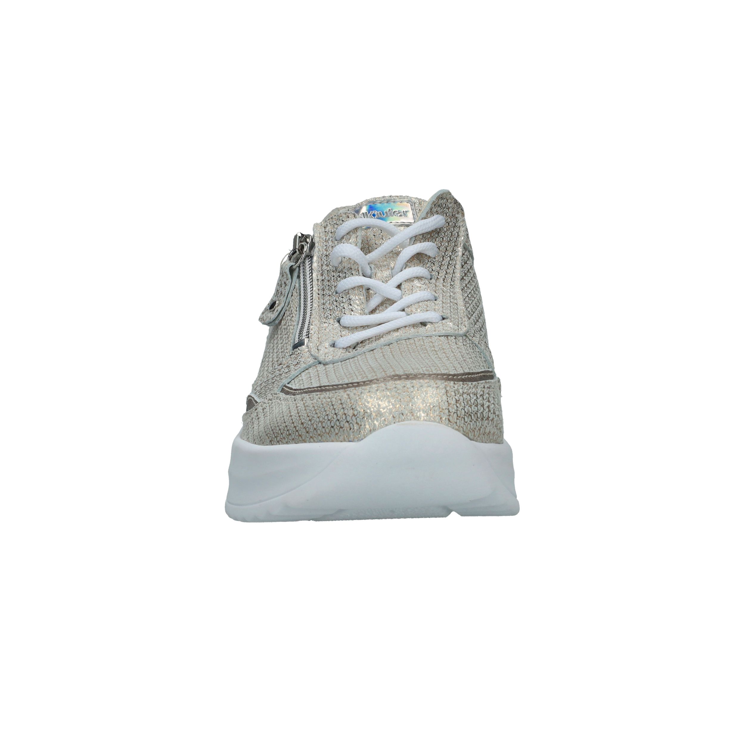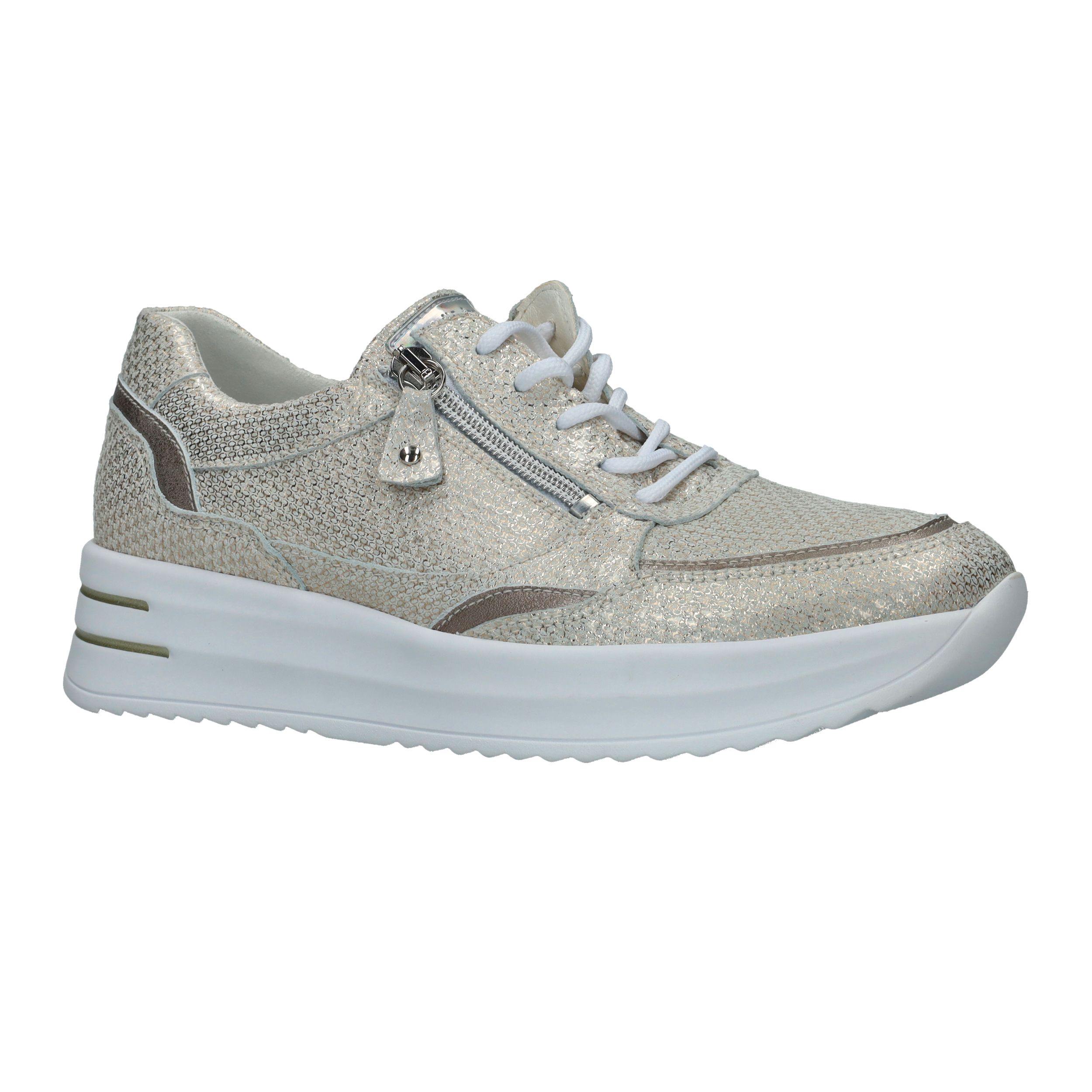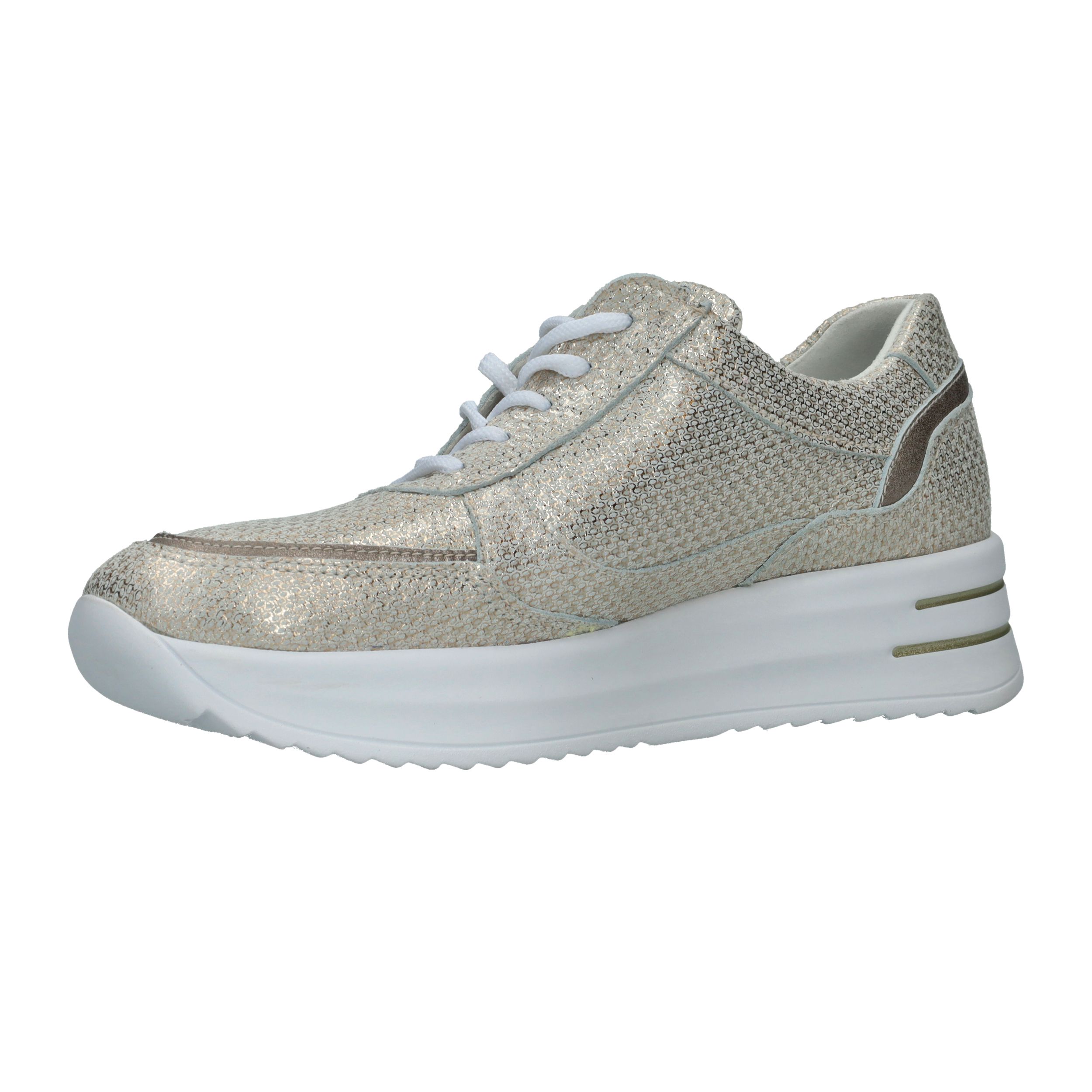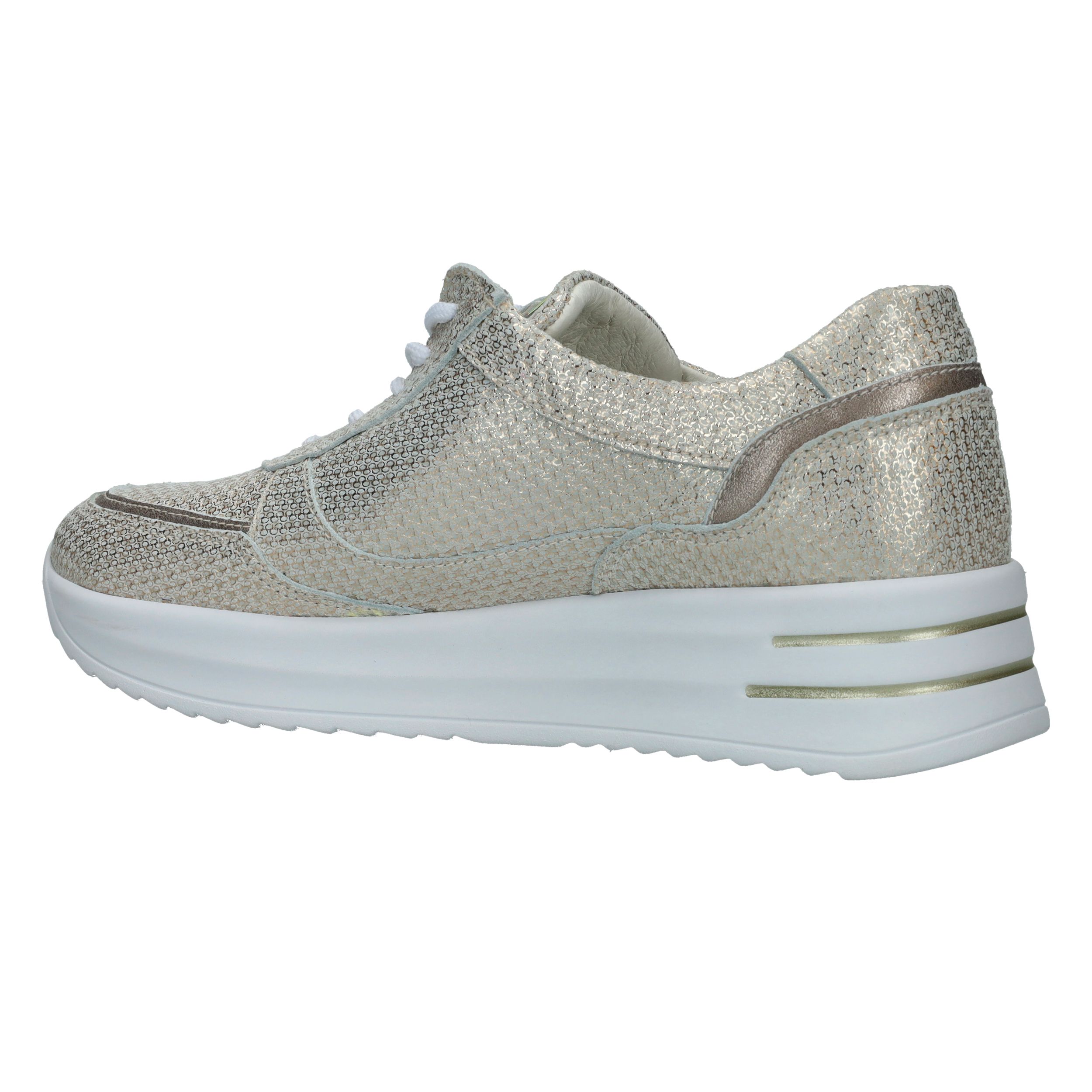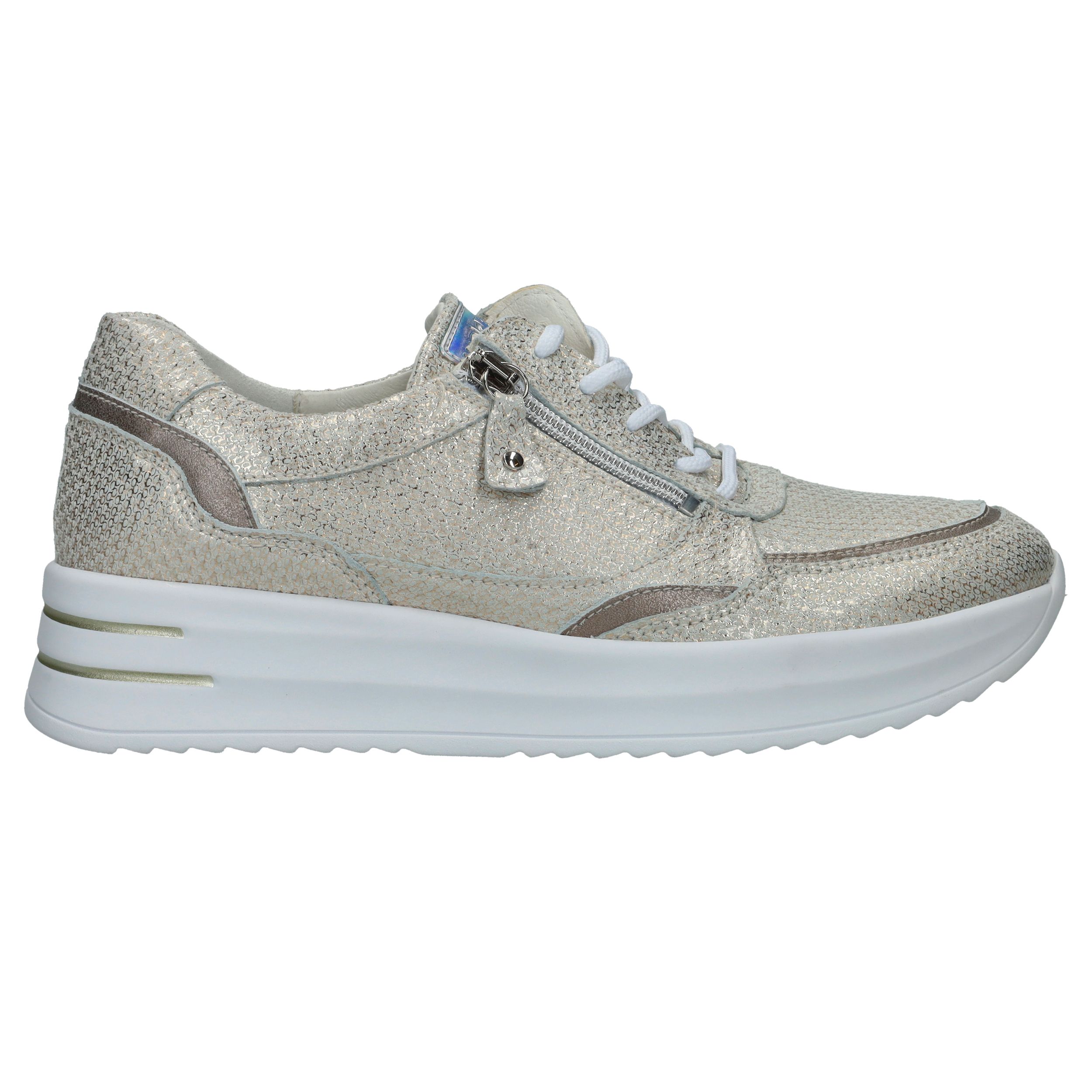 Met deze Waldlaufer Arianna veterschoen straal je helemaal. De parelmoer damessneaker heeft een metallic gouden print.