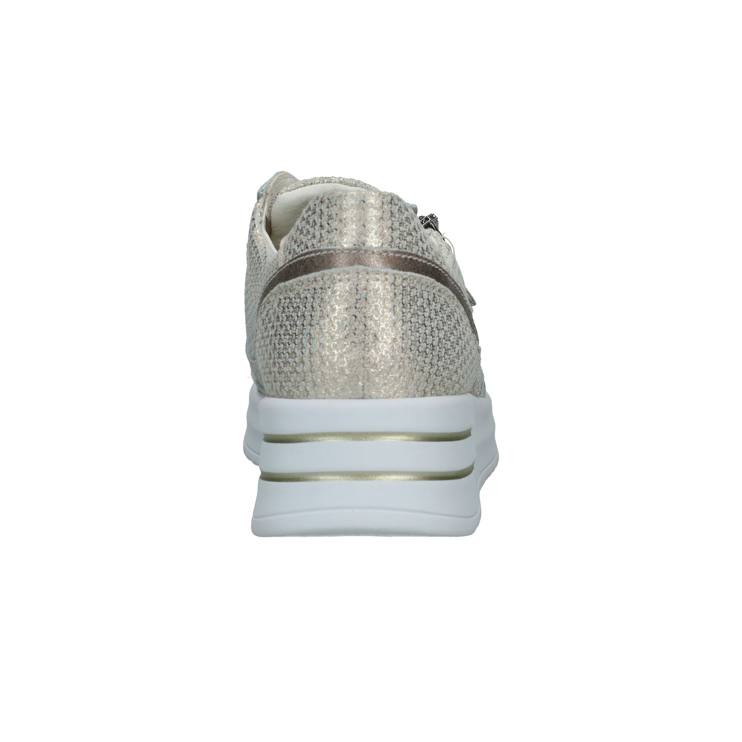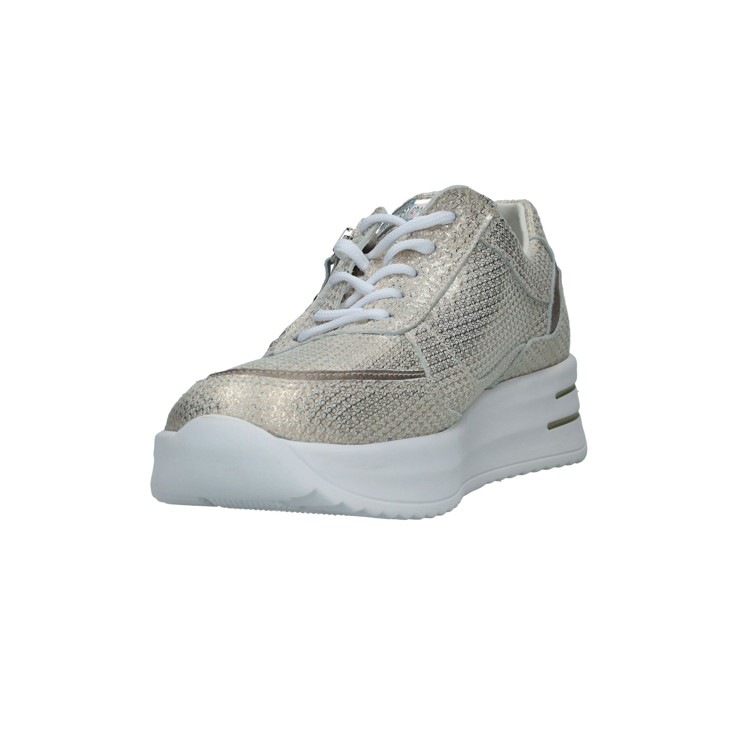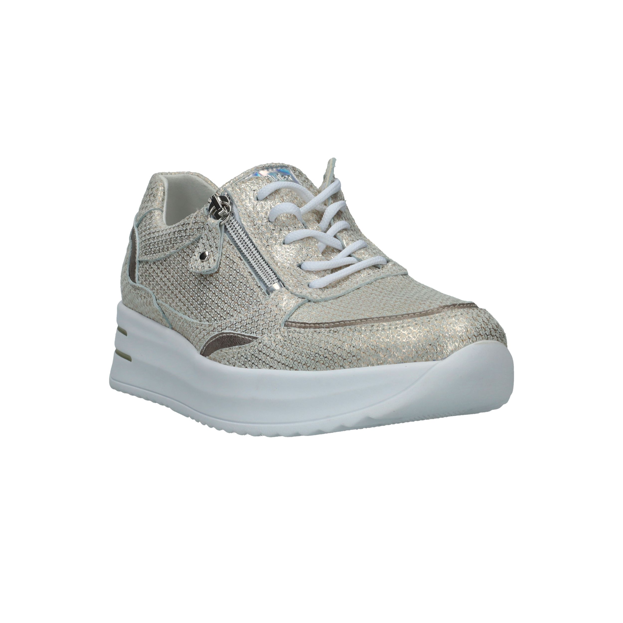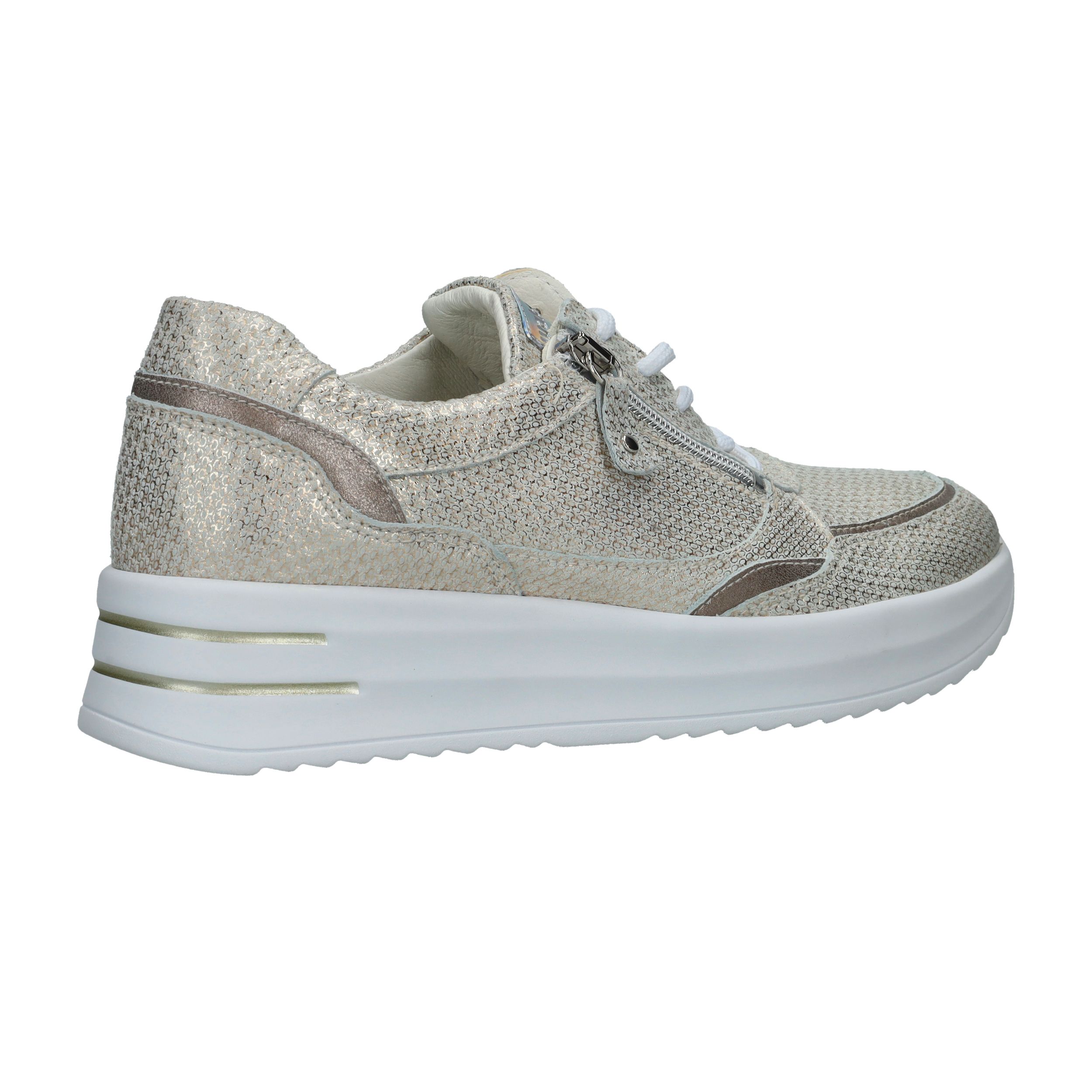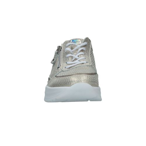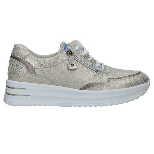 Met deze Waldlaufer Arianna veterschoen straal je helemaal. De parelmoer damessneaker heeft een metallic gouden print.