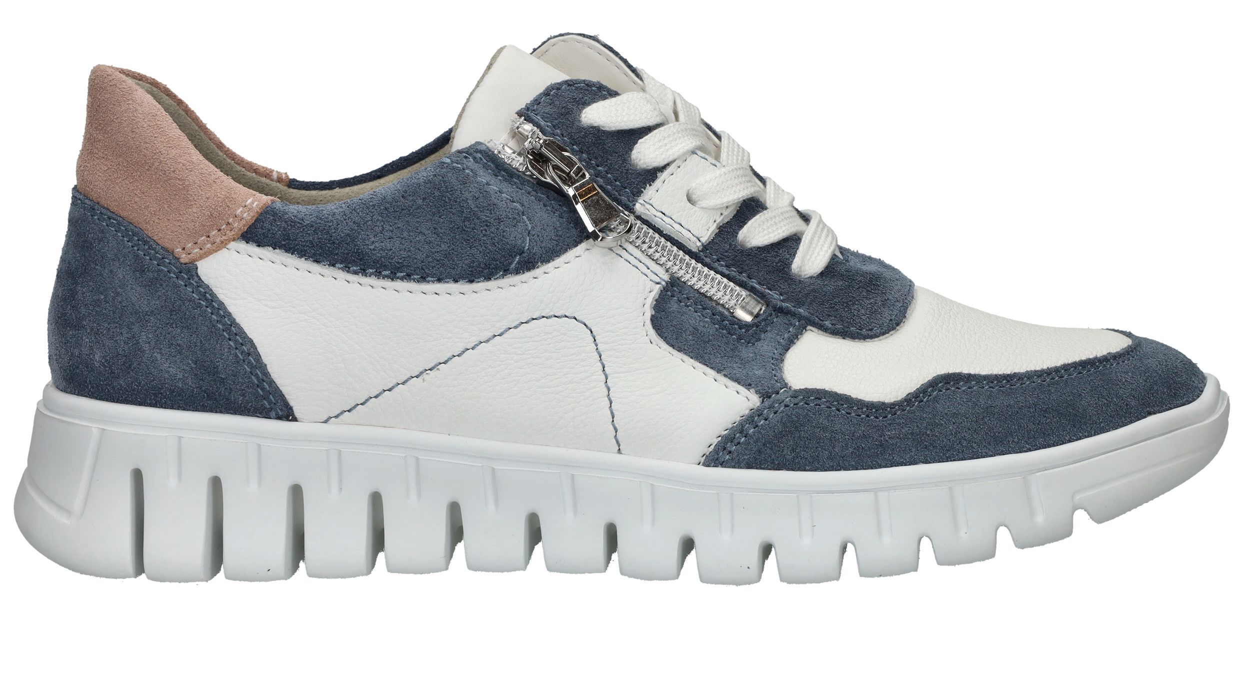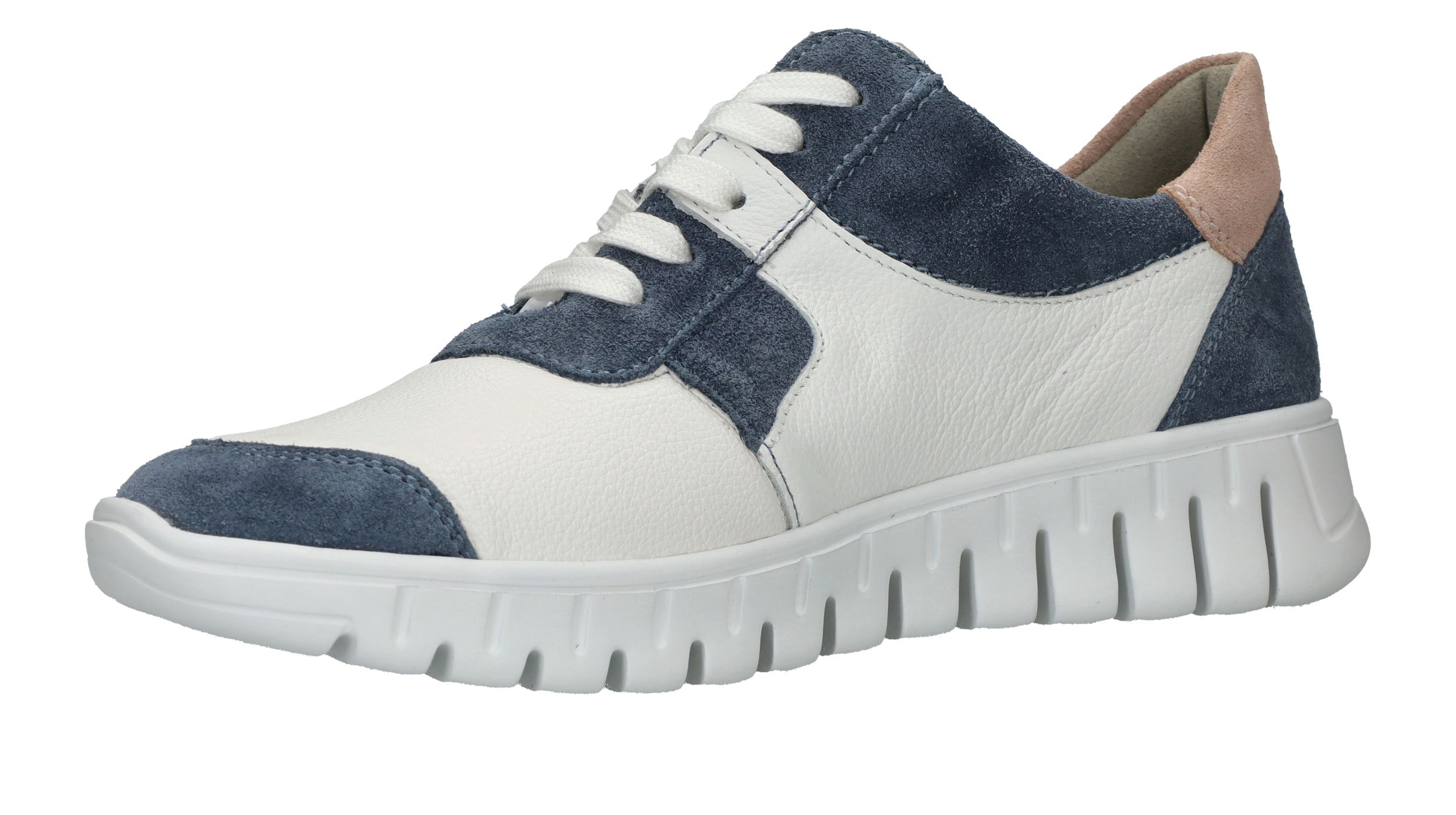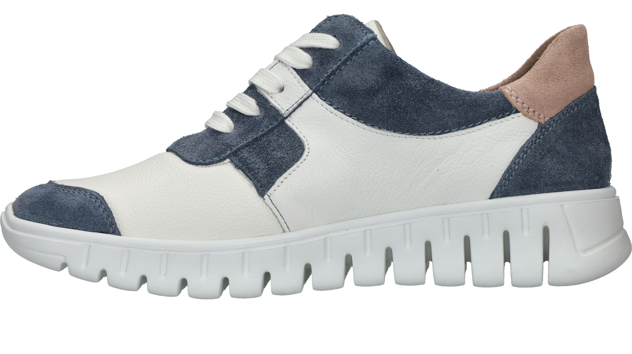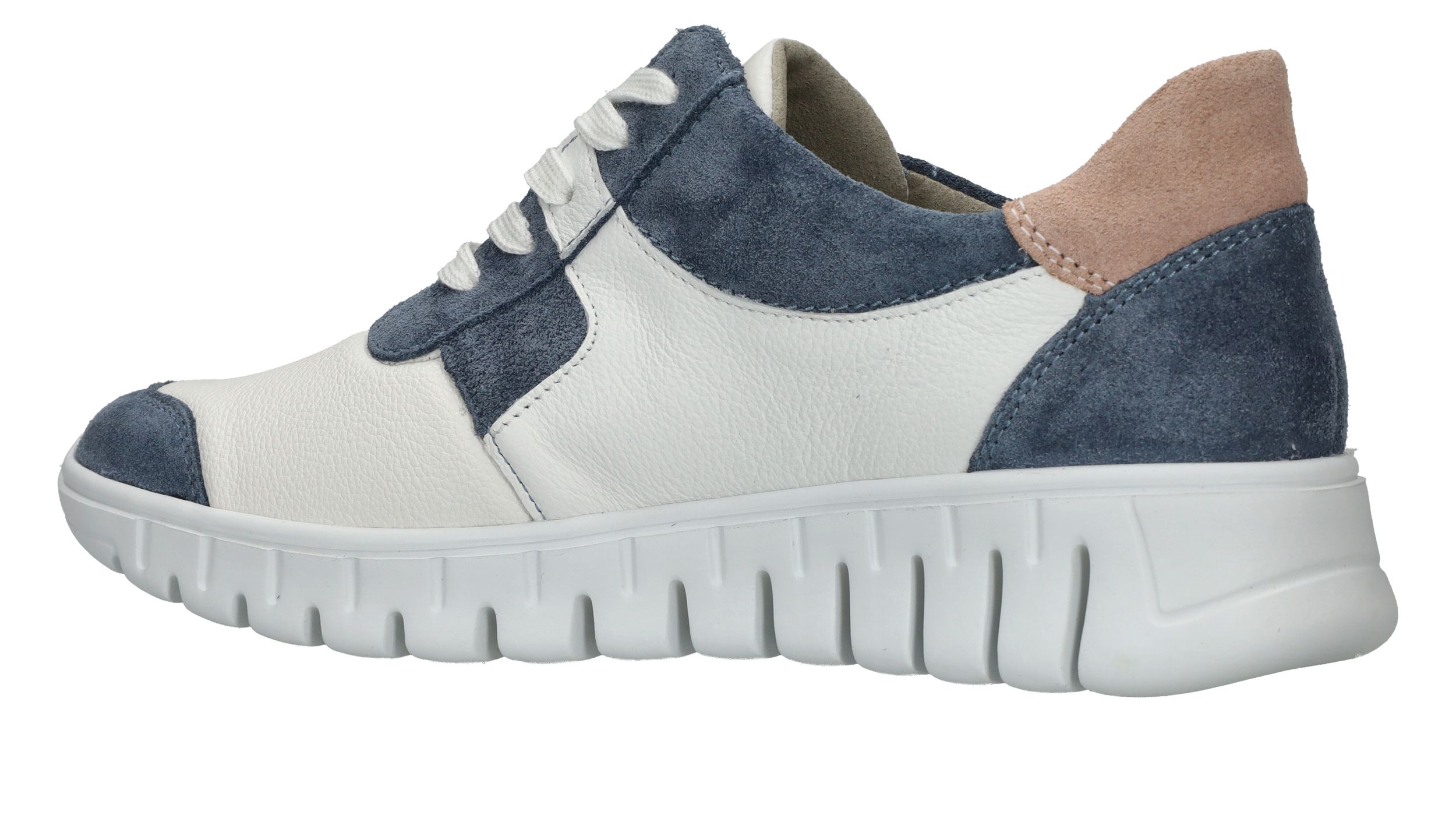 Comfortabele en lichtgewicht Waldlaufer Birdy veterschoen in het wit met jeansblauwe accenten. De schoen is gemaakt van leer en heeft een veter- en ritssluiting voor een makkelijke instap.