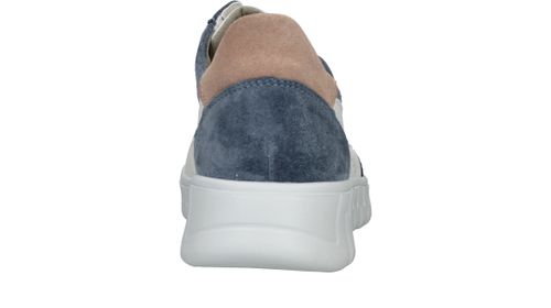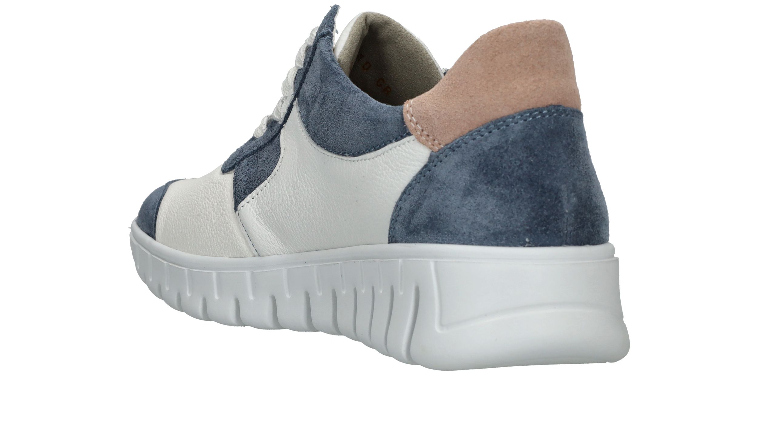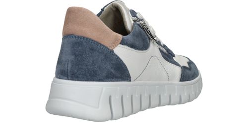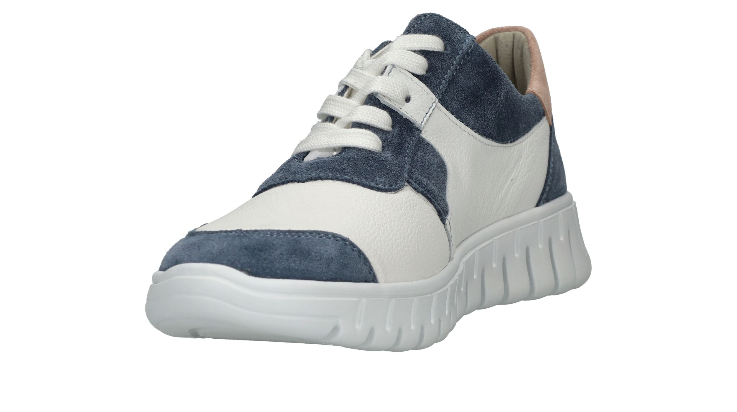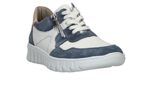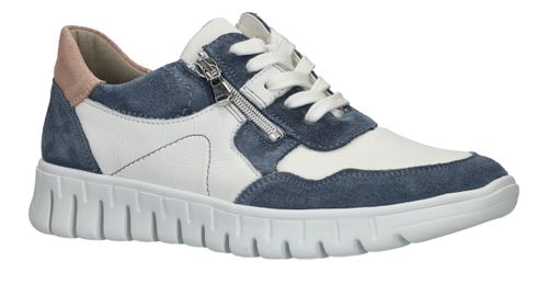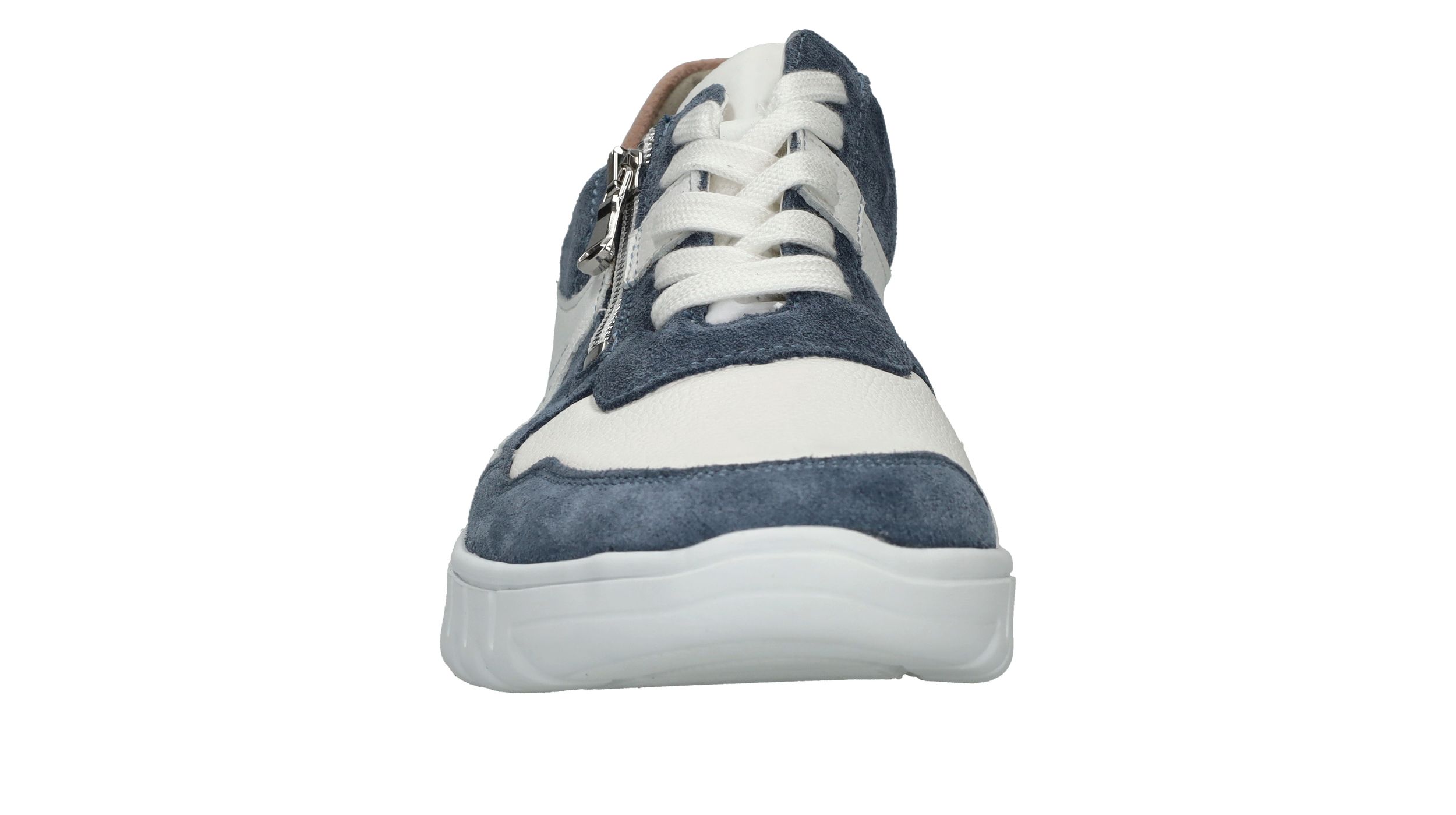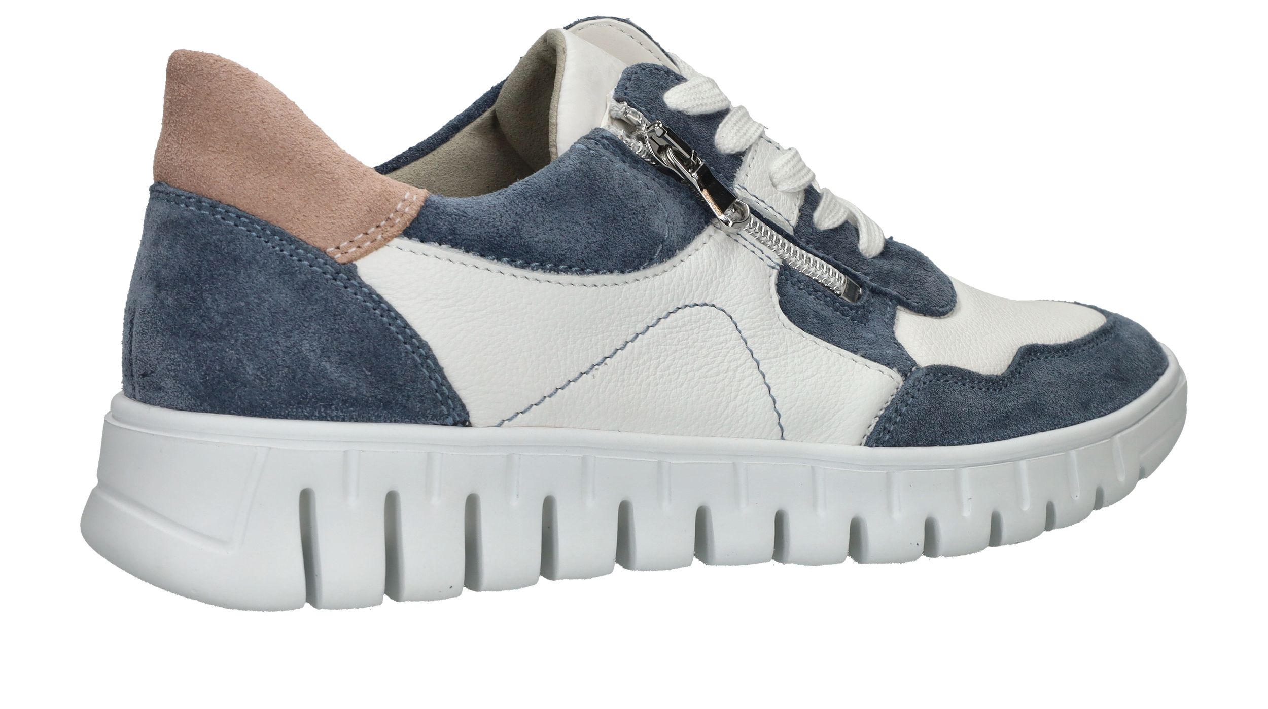 Comfortabele en lichtgewicht Waldlaufer Birdy veterschoen in het wit met jeansblauwe accenten. De schoen is gemaakt van leer en heeft een veter- en ritssluiting voor een makkelijke instap.