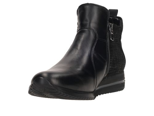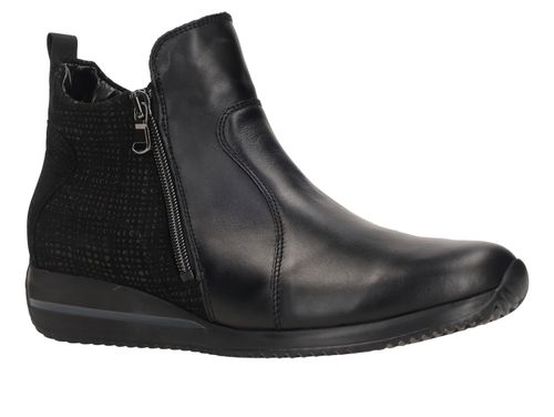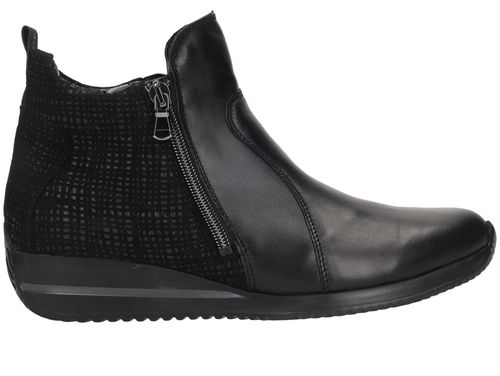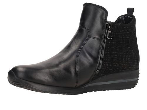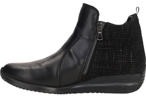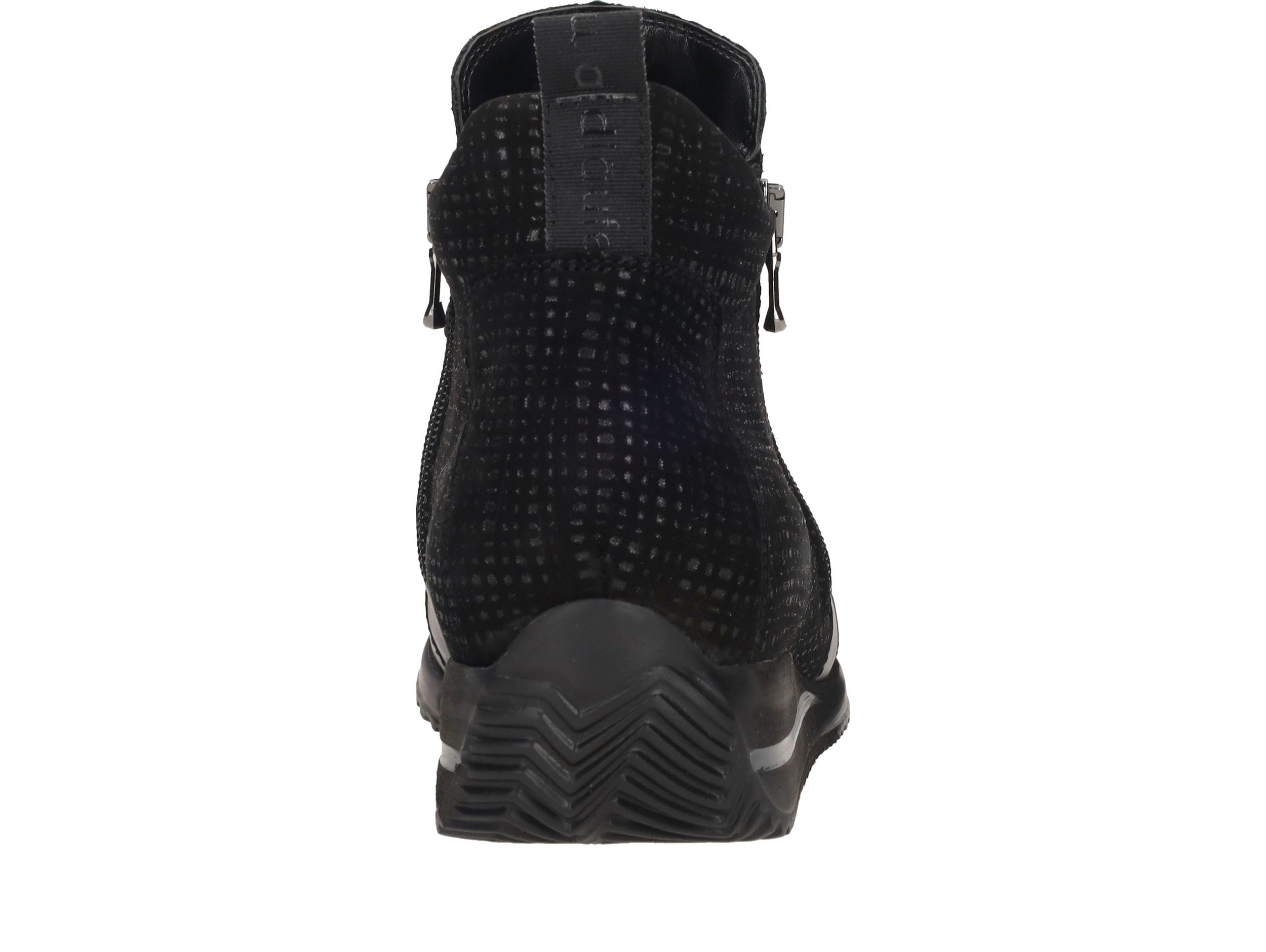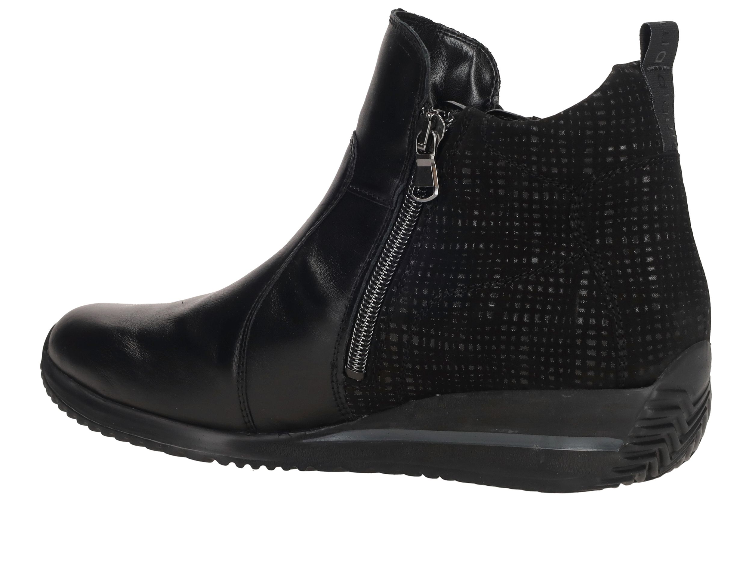 Deze Waldlaufer Himona sportieve boot loopt heel comfortabel door het voorgevormde voetbed. De zwarte damesschoen heeft een subtiele print aan de achterkant.