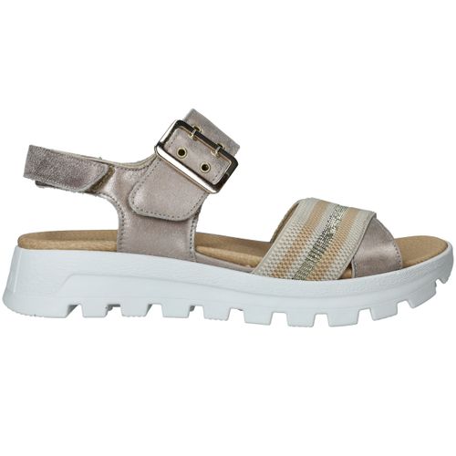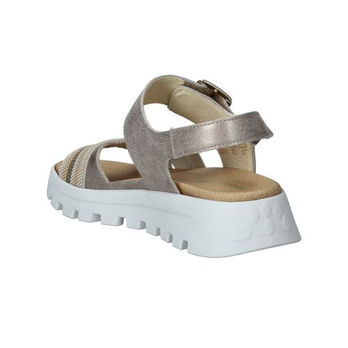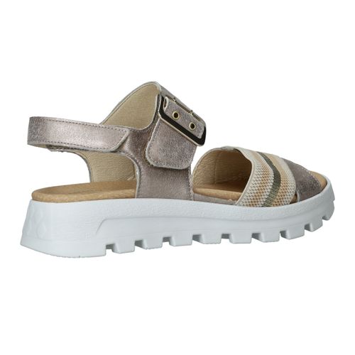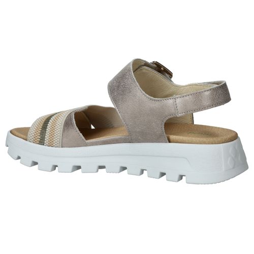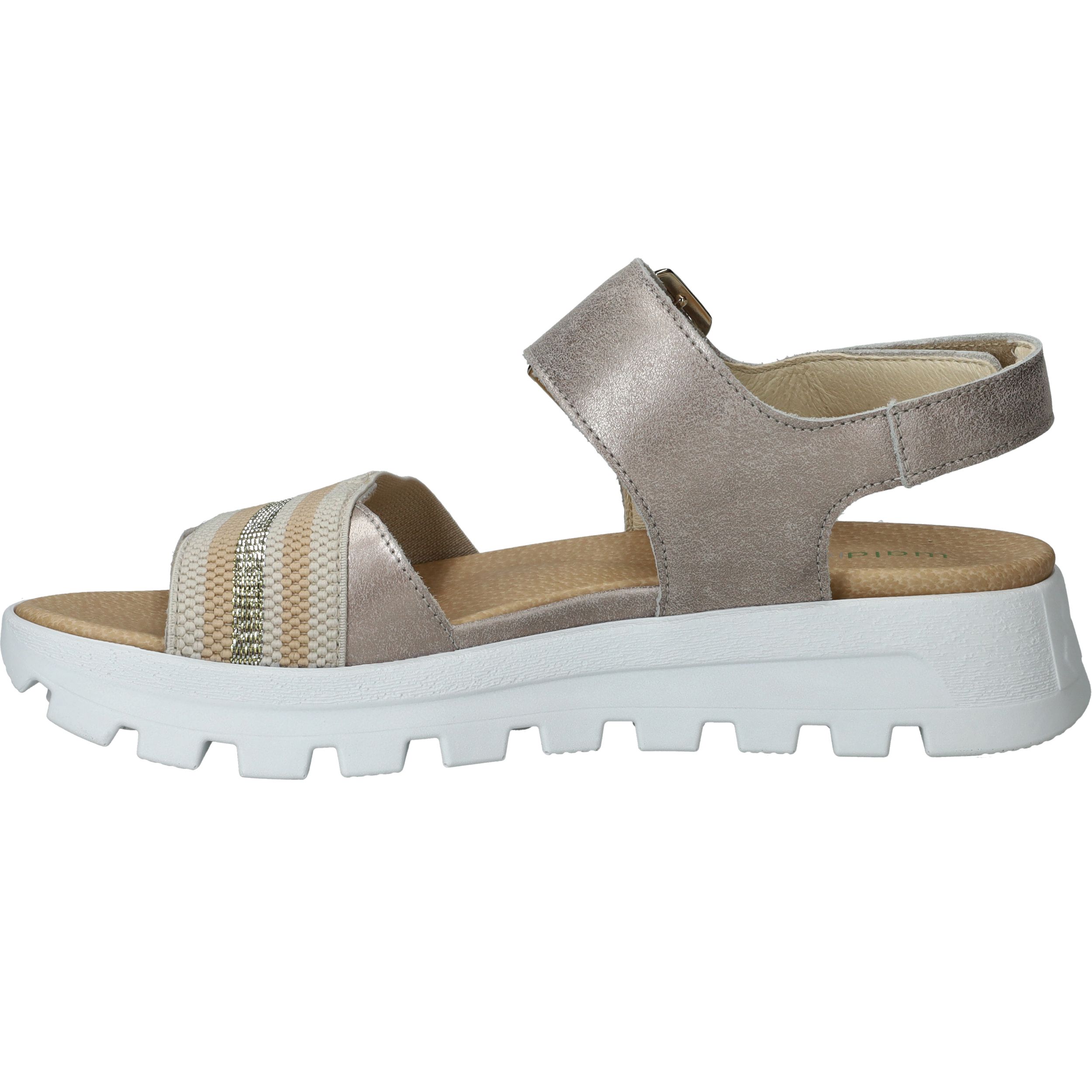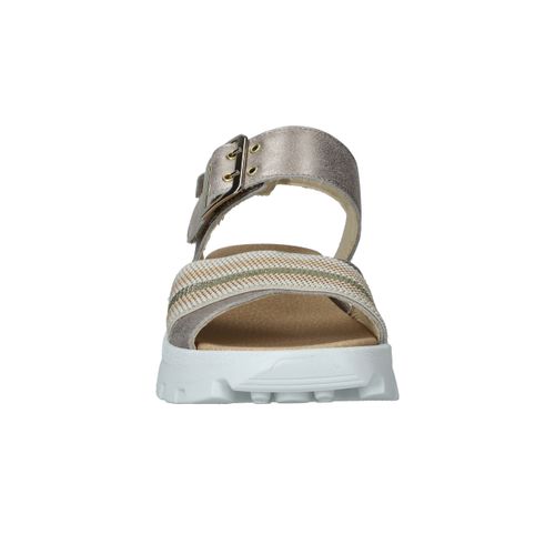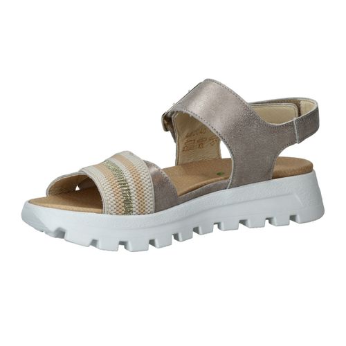 Deze Waldlaufer Nele sandaal is een mooie combinatie van comfort en trendy! De metallic zilveren sandaal heeft een gekleurd bandje en opvallende zool.